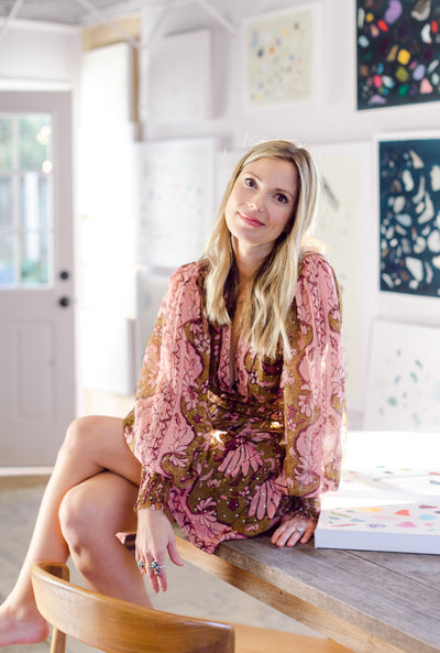 If Diana had a personal motto it would be “everything can be a treasure hunt if you try hard enough.” Growing up in Baton Rouge, Louisiana, Diana was fully trained in the art of the hunt by her mother who would drop all plans at the glimmer of an “Estate Sale Today” sign. Fortunately, this past time led to the ultimate find of a library of art and painting books which sent her in to a rabbit hole of learning about theories, lines, composition, and color that she hasn’t looked back from since. After years of self-study and practice, Diana launched her first collection to the public in fall of 2020. Her first series entitled “The Butterfly Collection” is built upon layers of color, glazers and washes carefully balanced to find the calm in the chaos. Diana names each piece after her favorite inspirational influences from authors to beaches to everyday people in her life that constantly bring her back to awe and wonder. Diana resides in Mount Pleasant, South Carolina with her husband Gabe, and her three boys Dixon, Charles, and Henry. If you are in the area and see a girl with paint chips on her hand digging for shells in the beach or through a stack of books in front of the library, please say hello!