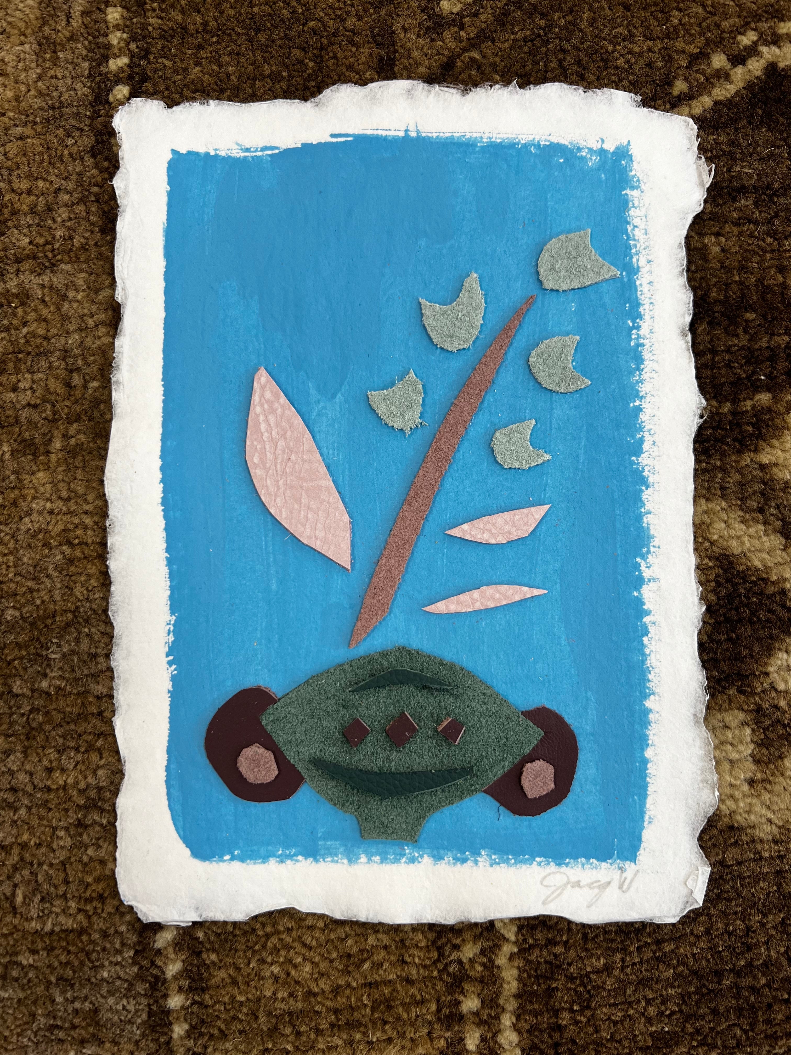 My passion as an artist comes from a life-long desire to create. Growing up with a parent in the military, I was consistently moving around from one place to the next, all the while collecting shapes, places and colors to put in my back pocket and one day use. I was always a painter but started to expand my idea of what could and couldn't be used as art in high school and continued until I finally found my material of choice while in college doing a project made of scrap textiles, including leather and other recycled materials. Years later, in 2018, I started my embarkment as an artist experimenting with different mediums and textiles that slowly evolved into my primary use of leather today. Currently, I live in Memphis, Tennessee with my husband, Alan, and our child, Arrison. When I'm not in the studio, we are often found enjoying local parks, taking nature walks led by our little one. Inspired by the landscapes I grew up seeing and my travels, I soak in my surroundings and then illustrate them in my own way through collages. I am always mesmerized with the way the calming colors and soft layered textures of my pieces can speak to others without using words. A little leather on a wooden panel creates a shared experience between you, the viewer, and me, the artist. This connection brings me such joy and compels me to create the way I see the world: full of color and unsuspecting textures.