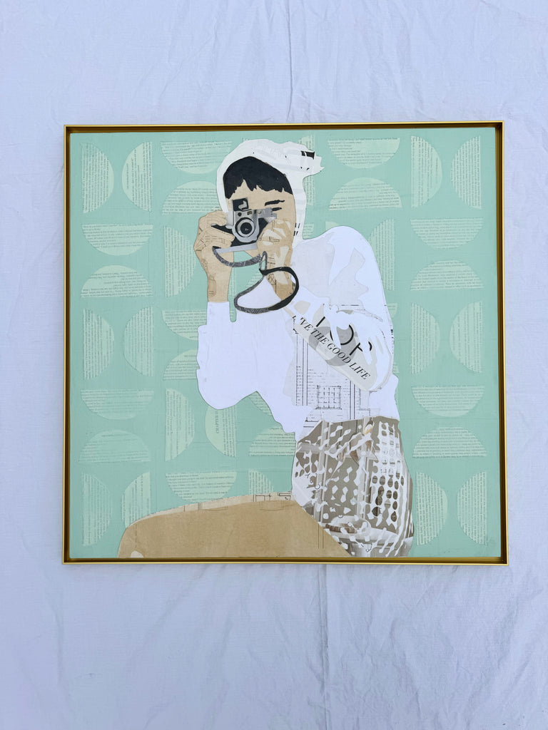 Melissa Ellen is a self-taught mixed-media artist based in Nashville, TN. Her work merges collective memory with modern perspectives, using layered materials like magazine clippings and vintage book pages to reimagine familiar images. Through her intricate compositions, Melissa invites viewers to explore the connections between history and today, offering nostalgia with a contemporary twist. In her twenties, Melissa specialized in print design before founding and running a successful magazine and online marketplace for the lifting and construction industry. After the premature birth of her fourth child, she chose to sell her business and dedicate her time to family. A move to North Carolina in 2020 reignited her passion for art, where she began exploring themes of transformation, memory, and identity through her unique collage-based style. Now back in Nashville since 2022, Melissa continues her creative journey while balancing life with her husband and four children. Her work reflects an enduring curiosity about the connections between the past and present, bringing depth and storytelling to each piece.