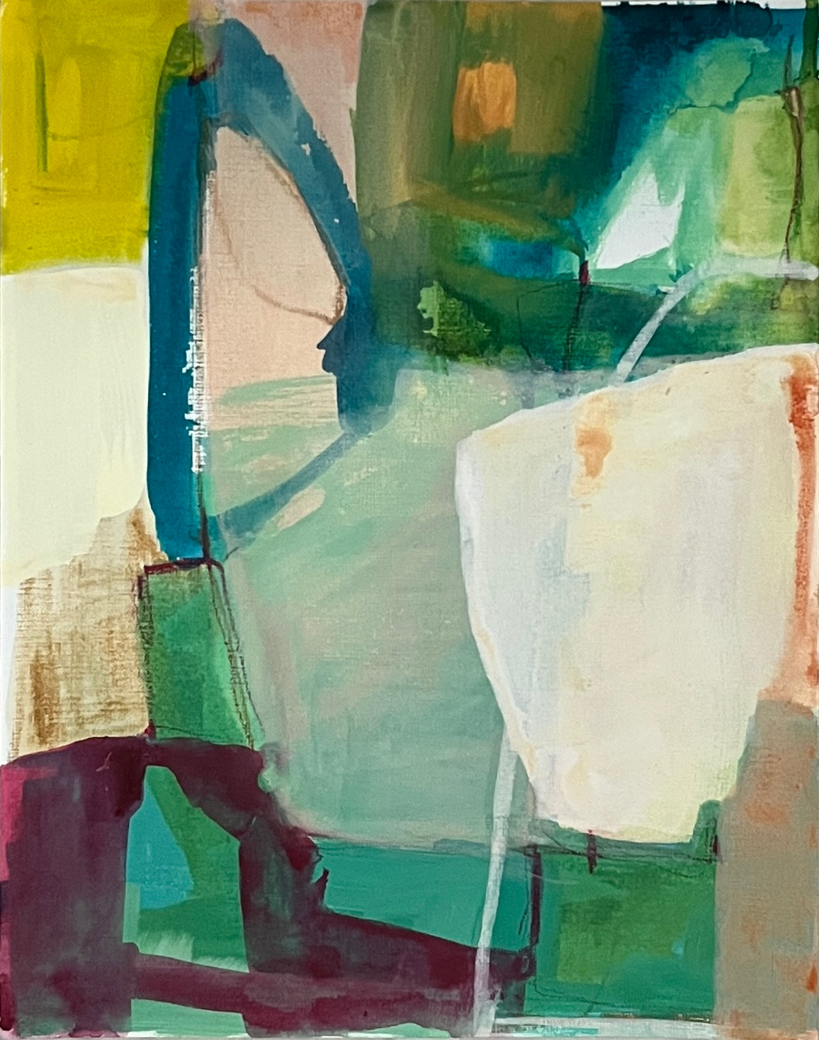 I find ultimate freedom in abstract expressionism and as such, I’m in search of the best way to convey who I am at the moment of creating. It is not to say it is a free-for-all; there is still structure within. I implement the same principles that realist painters employ with the absence of representation: composition, hierarchy, variety, juxtaposition are vital to a successful painting. But I do not limit myself to one medium or the other. I work in oil, acrylics and gouache and depending on what I’m exploring at the time I will choose one or more to express it. I also explore through a combination of paint and collage. It is through all of these various methods and mediums that I am able to share my fullest expression of self and my authenticity. My paintings ultimately are self portraits that are created from both past experiences and also future hopes and dreams. It is my goal to invoke a feeling for the viewer. When it does I have succeede