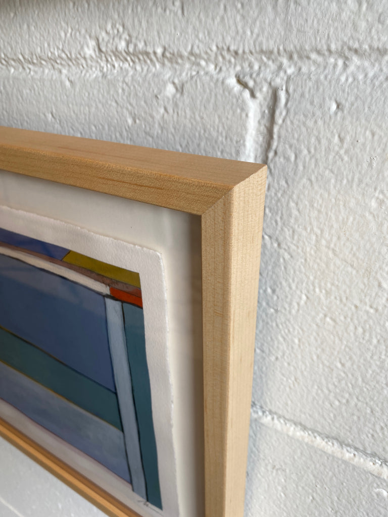 gouache and ink on deckled edge paper, floating on white mat, in maple wood frame