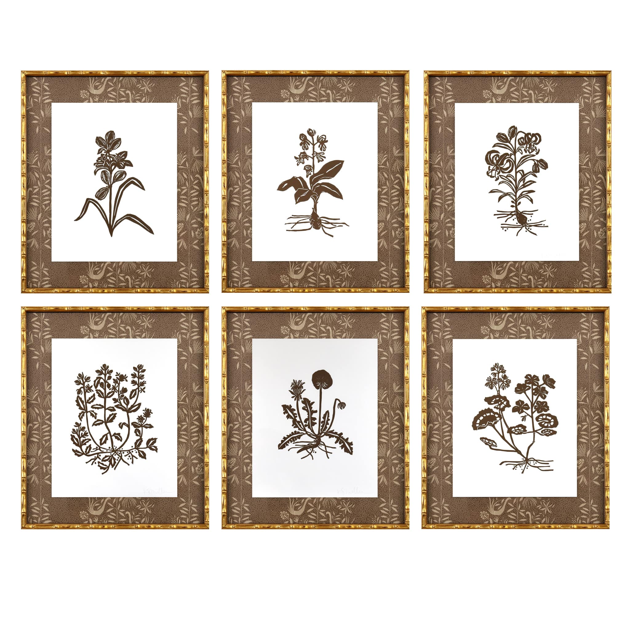 hand carved and hand printed linocut floating on garden vine wallpaper, framed in gold bamboo frame