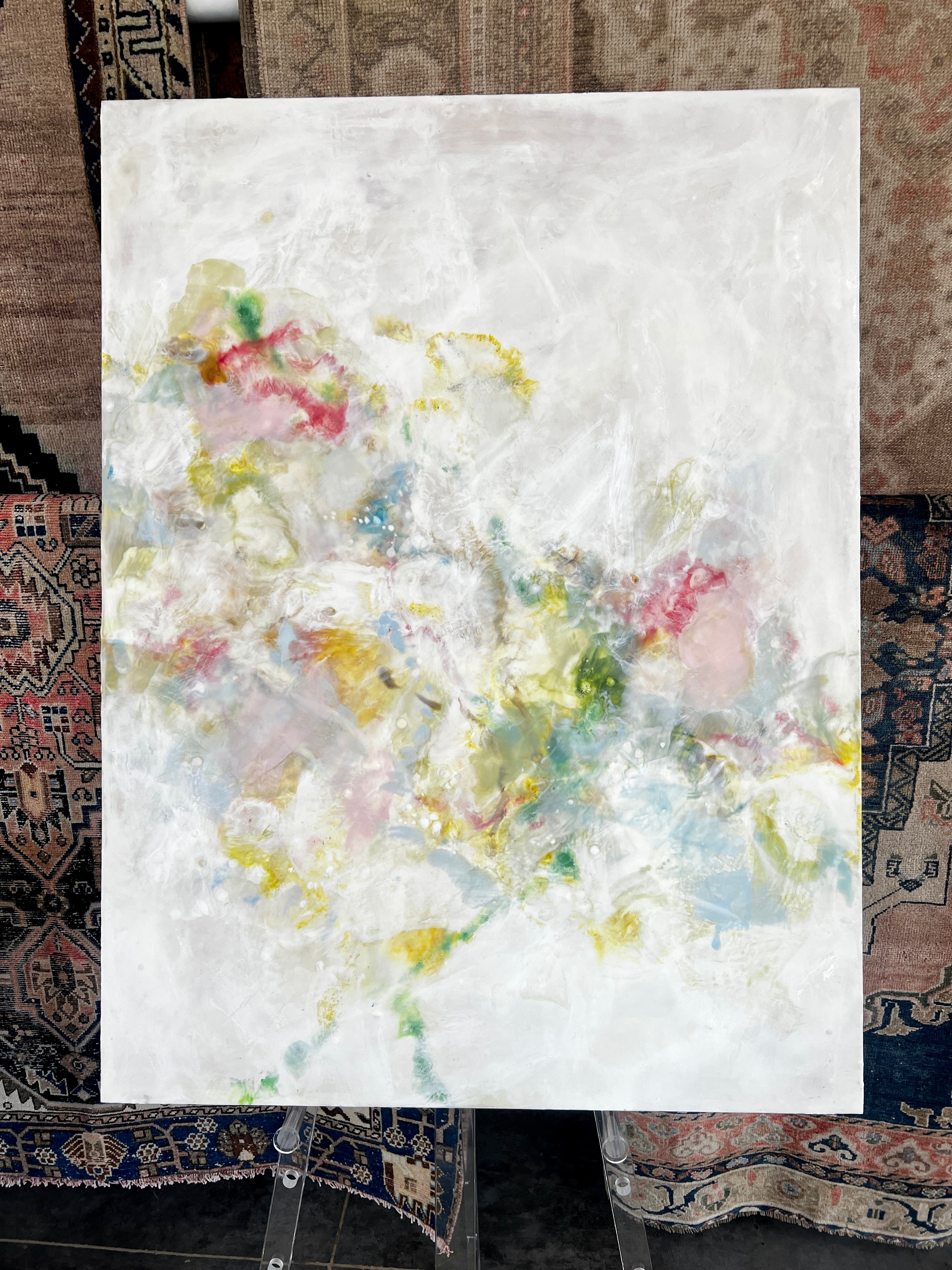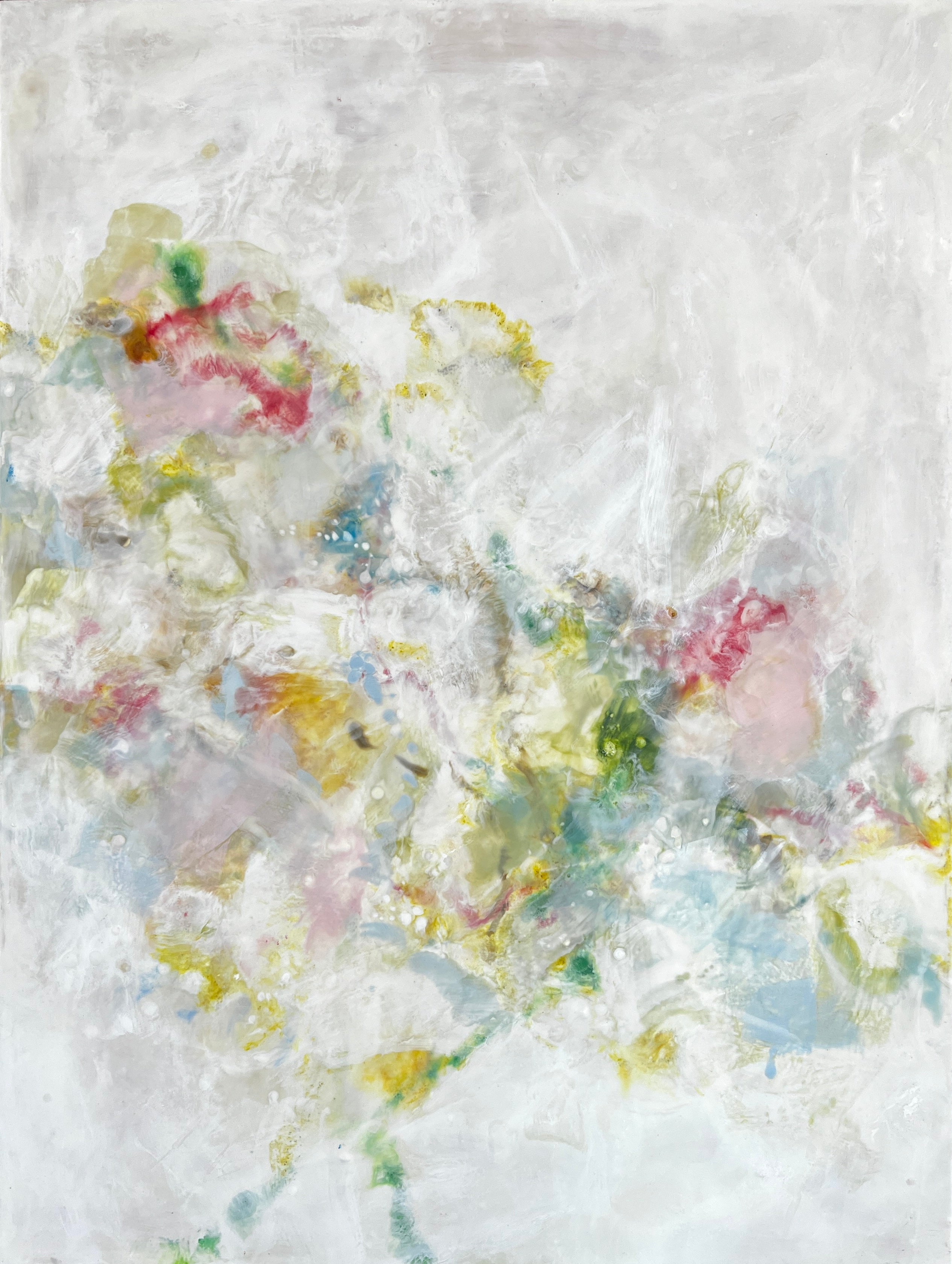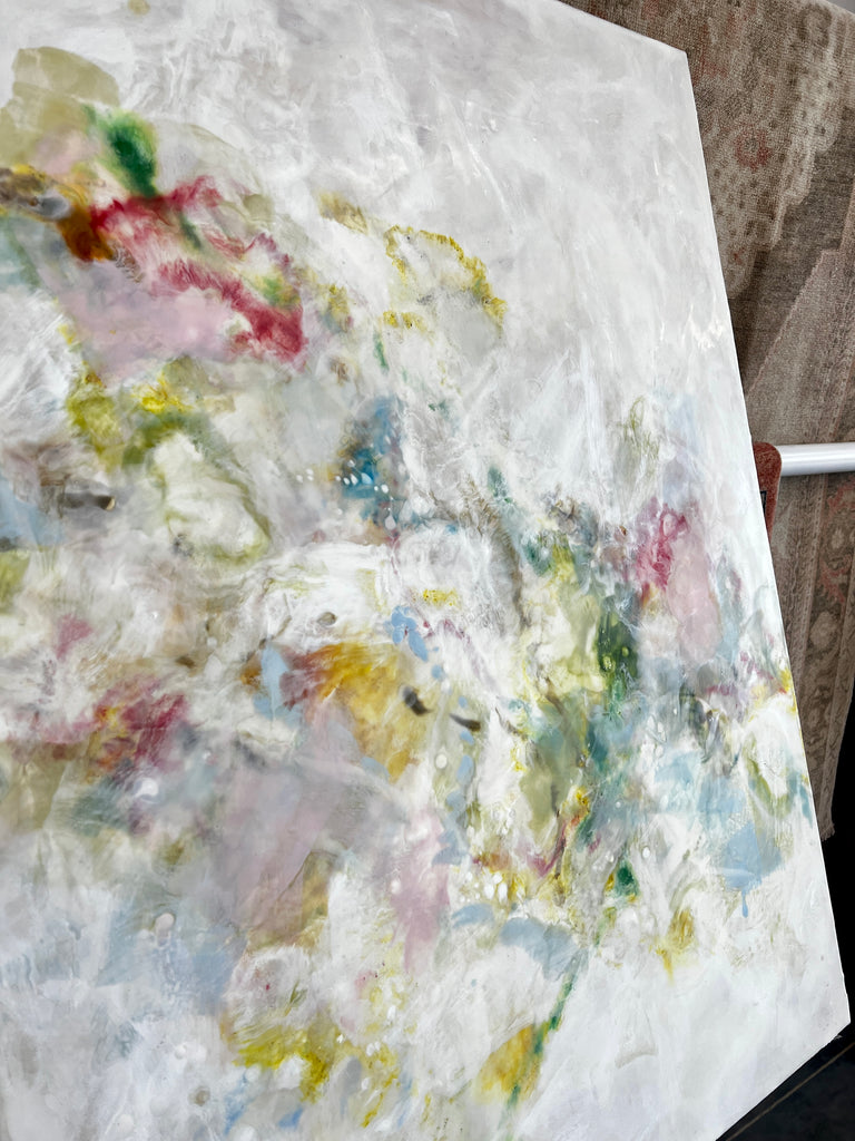 encaustic on wood, framed in neutral wood floating frame
