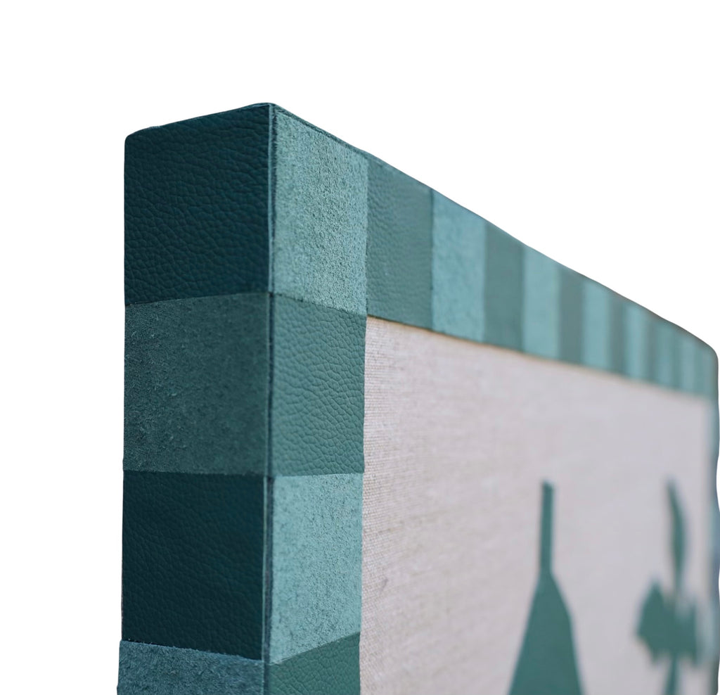 My passion as an artist comes from a life-long desire to create. Growing up with a parent in the military, I was consistently moving around from one place to the next, all the while collecting shapes, places and colors to put in my back pocket and one day use. I was always a painter but started to expand my idea of what could and couldn't be used as art in high school and continued until I finally found my material of choice while in college doing a project made of scrap textiles, including leather and other recycled materials. Years later, in 2018, I started my embarkment as an artist experimenting with different mediums and textiles that slowly evolved into my primary use of leather today. Currently, I live in Memphis, Tennessee with my husband, Alan, and our child, Arrison. When I'm not in the studio, we are often found enjoying local parks, taking nature walks led by our little one. Inspired by the landscapes I grew up seeing and my travels, I soak in my surroundings and then illustrate them in my own way through collages. I am always mesmerized with the way the calming colors and soft layered textures of my pieces can speak to others without using words. A little leather on a wooden panel creates a shared experience between you, the viewer, and me, the artist. This connection brings me such joy and compels me to create the way I see the world: full of color and unsuspecting textures.