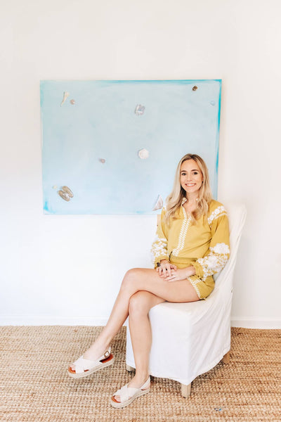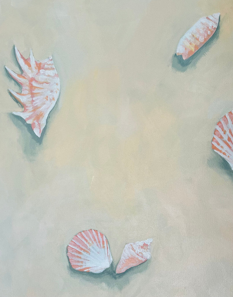 Pensacola based artist, Kelly Whibbs, finds her inspiration right at home on the Gulf Coast. The vibrant beauty and serene energy of her coastal town is infused into her work through layers of color and texture. Most of Kelly’s works are acrylic on canvas and feature organic forms one might find near the sea. She is probably most well known for her paintings of palms, which are featured in many of her collectors’ homes and businesses. Her most recent works are influenced by her seashell collection from a lifetime of beachcombing on Pensacola Beach and Maryland’s Eastern Shore. Kelly enjoys experimenting with scale and light, inviting the viewer to step forward and take a closer look. When she is not painting, Kelly can be found spending time with her husband, their three little boys, and their dog, Chessy. They are on the water whenever possible- whether boating, catching crabs, fishing, or just having themselves a beach day.
