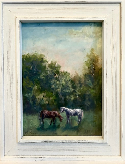 oil on canvas panel, in white wood frame