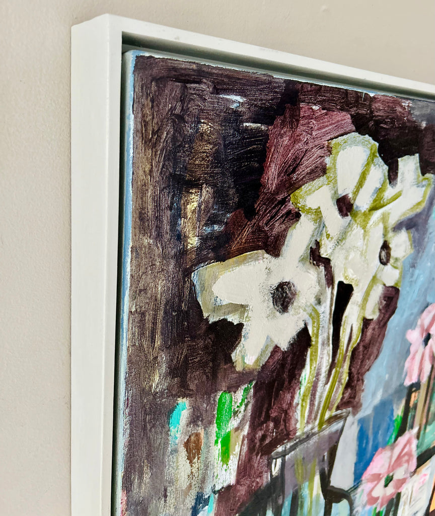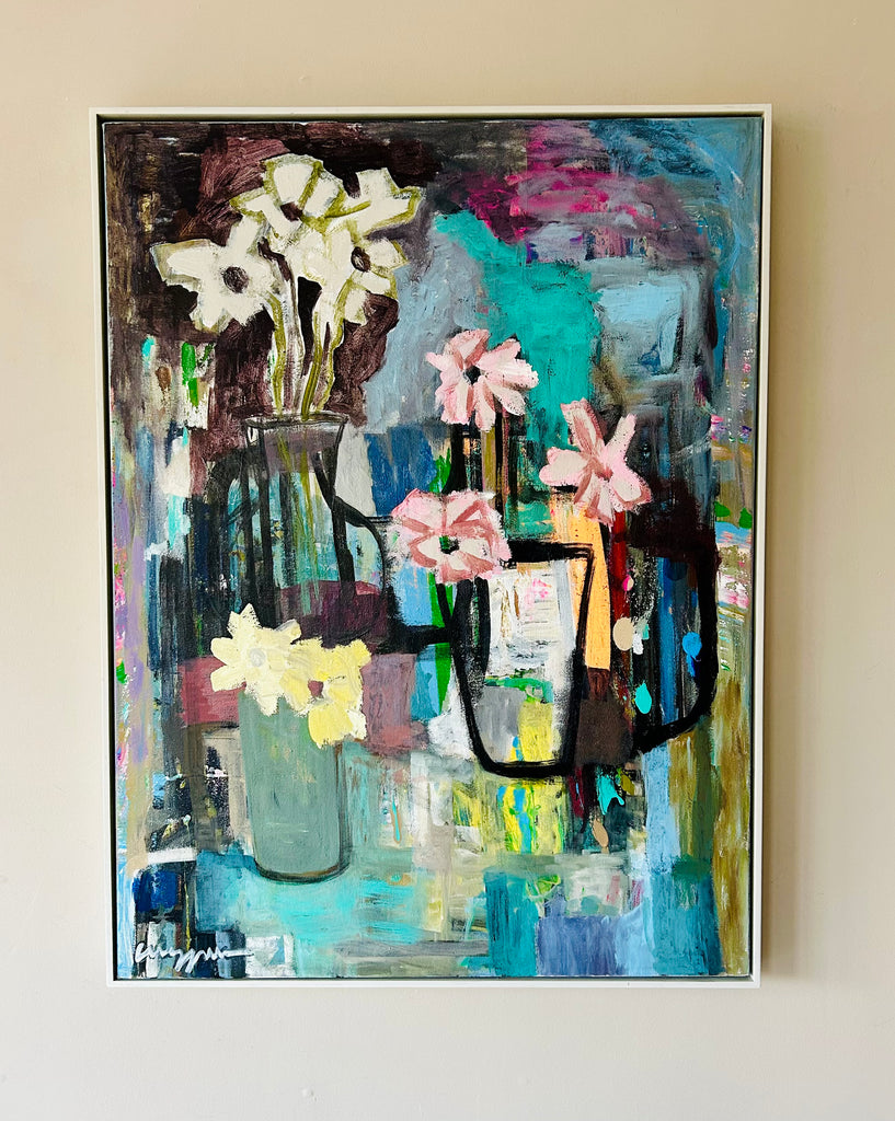 acrylic on deep profile canvas, framed in light gray wood floater frame