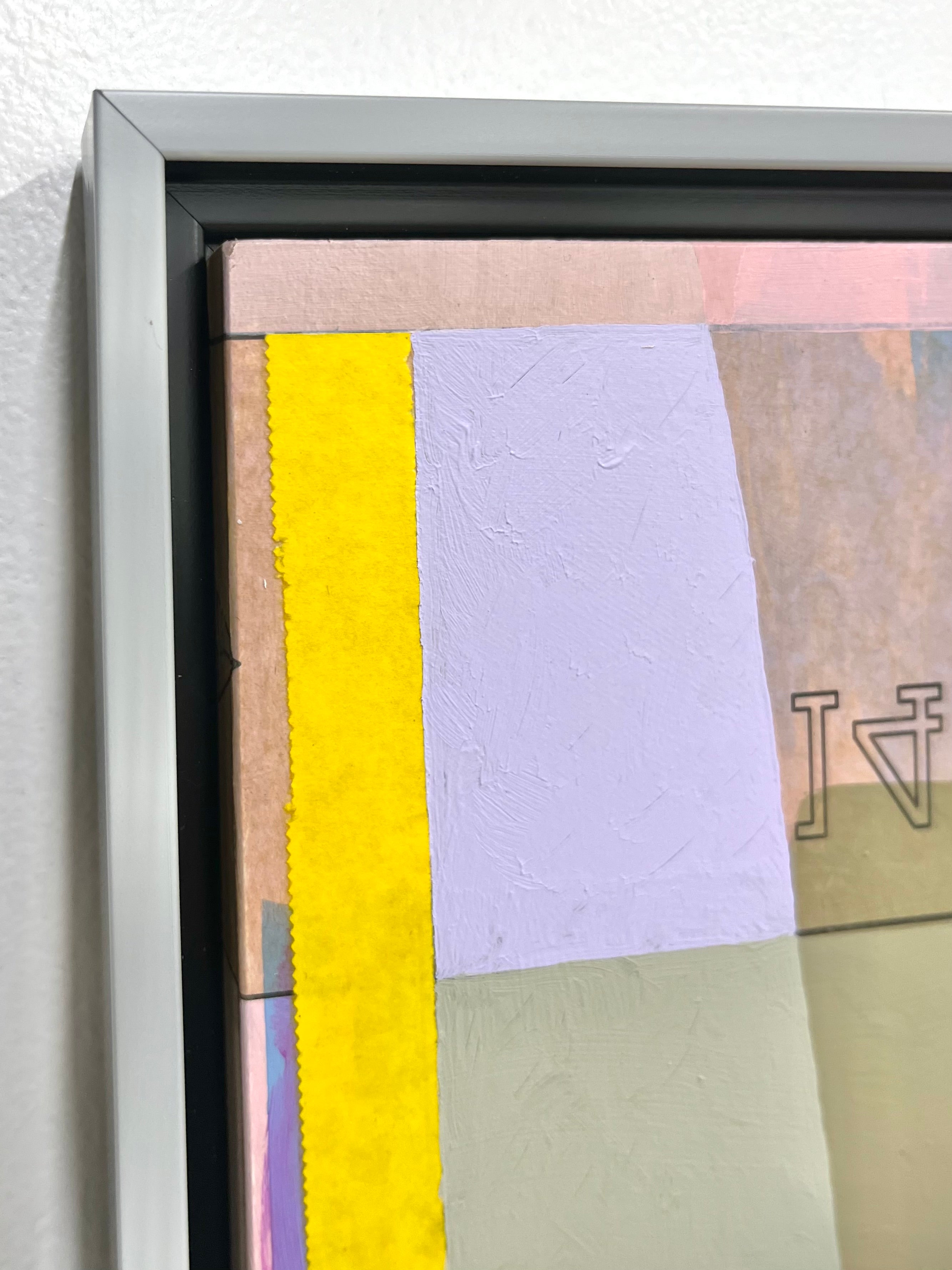 mixed media collage on panel, framed in silver floater frame