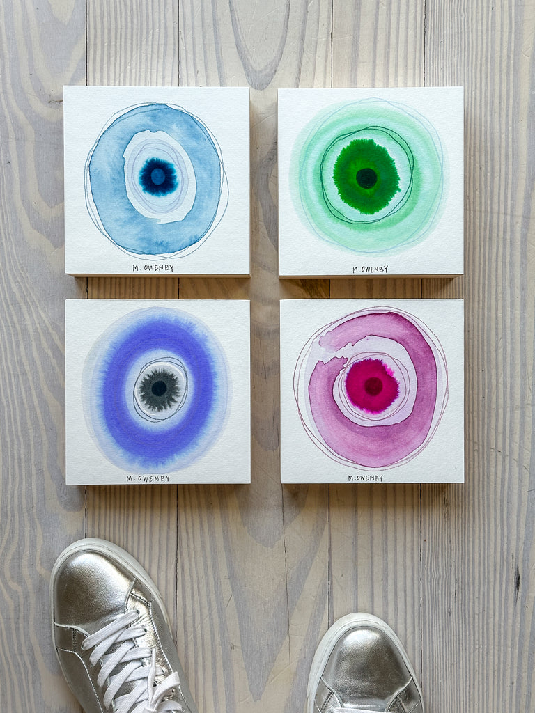 Michelle was born in Asheville, NC with a deeply rooted “maker” heritage. She developed a love of art, nature, travel + spirituality which greatly inform the foundation of her work. Influenced by her mother + grandmother, she has been using her hands + imagination since she was a child to create artful objects. Her work often reflects colors + patterns found in nature where she spent much of her childhood with her dad, who was an avid-outdoorsman. She enjoys a clean, abstract aesthetic using mainly water-based mediums, paper + natural fibers. In almost all of her work you will see her intrigue with the opposing forces of dualism. Her works are spiritual + reflective outpourings that she tries to nurture daily. Faith + family are her highest priorities so, she works from her home studio in Sullivan’s Island, SC where both peaceful + joyful inspiration are found. She resides there with her beloved husband, 2 loving teenage boys + their lazy yellow lab. Her work has been seen throughout the Southeast + licensed in worldwide markets.