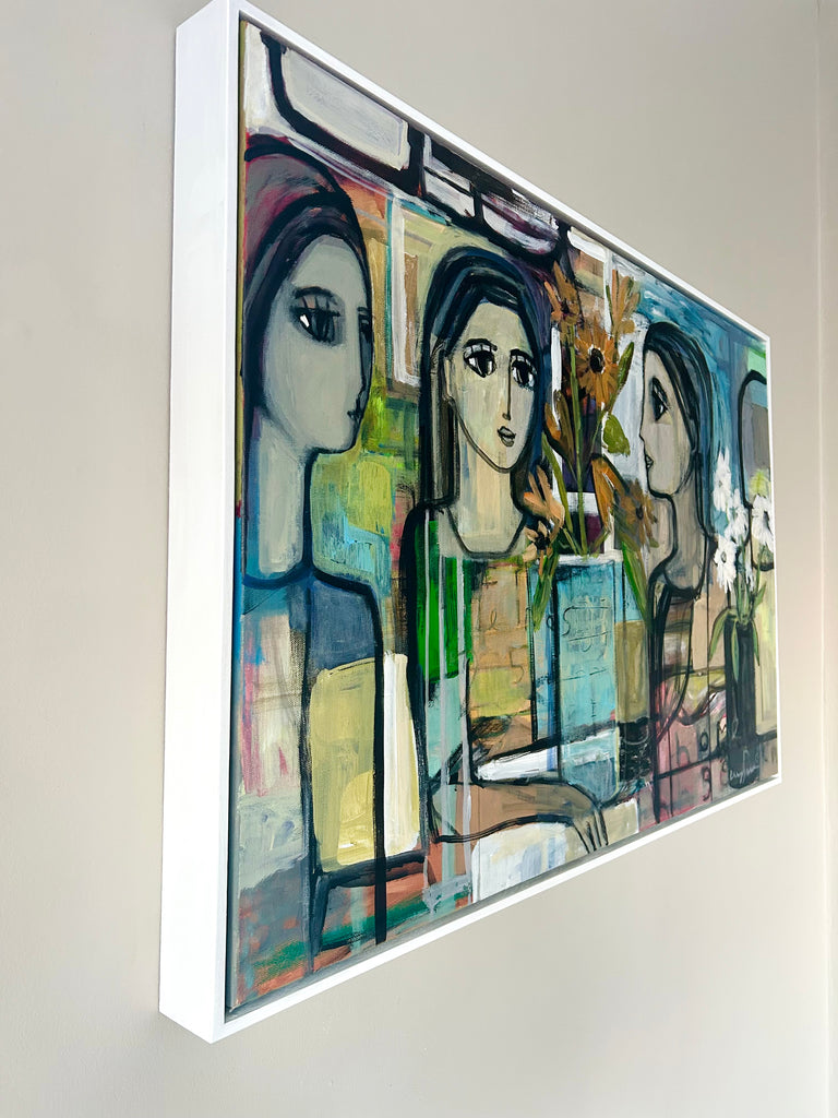 mixed media on canvas, framed in white wooden floater frame