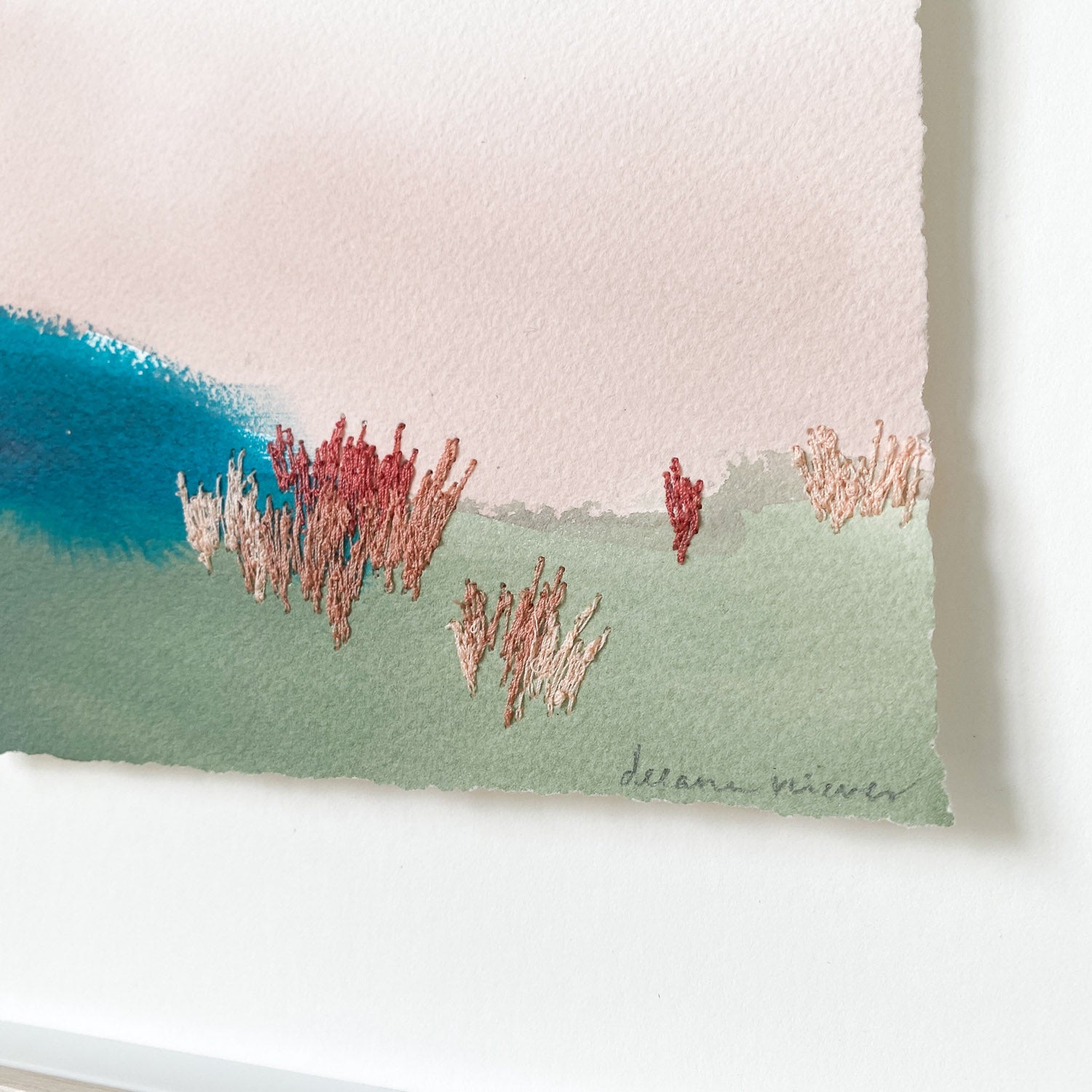 mixed media on paper, floating on white mat, in wood shadowbox frame