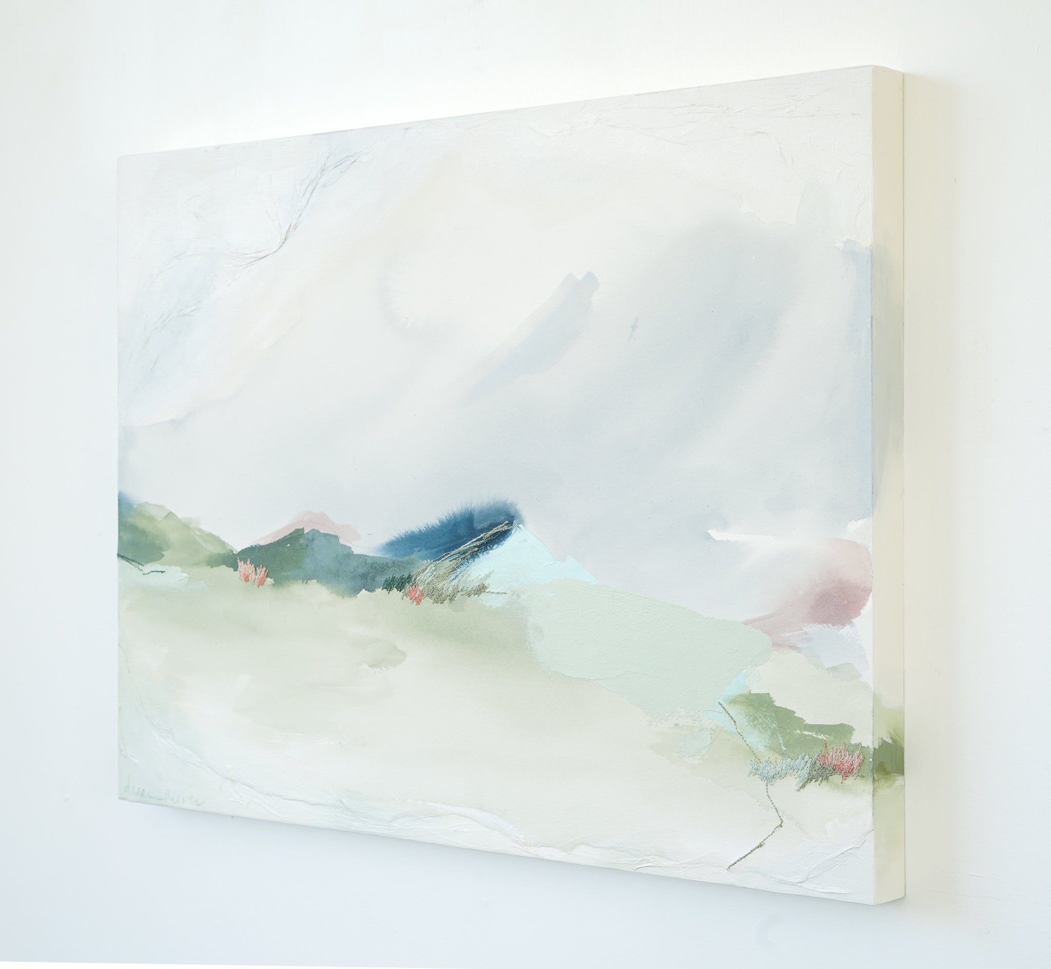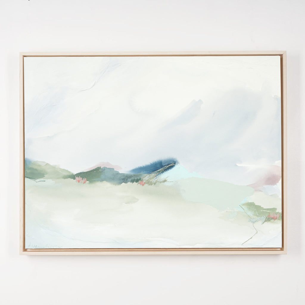 mixed media on cradled wood, in maple floater frame