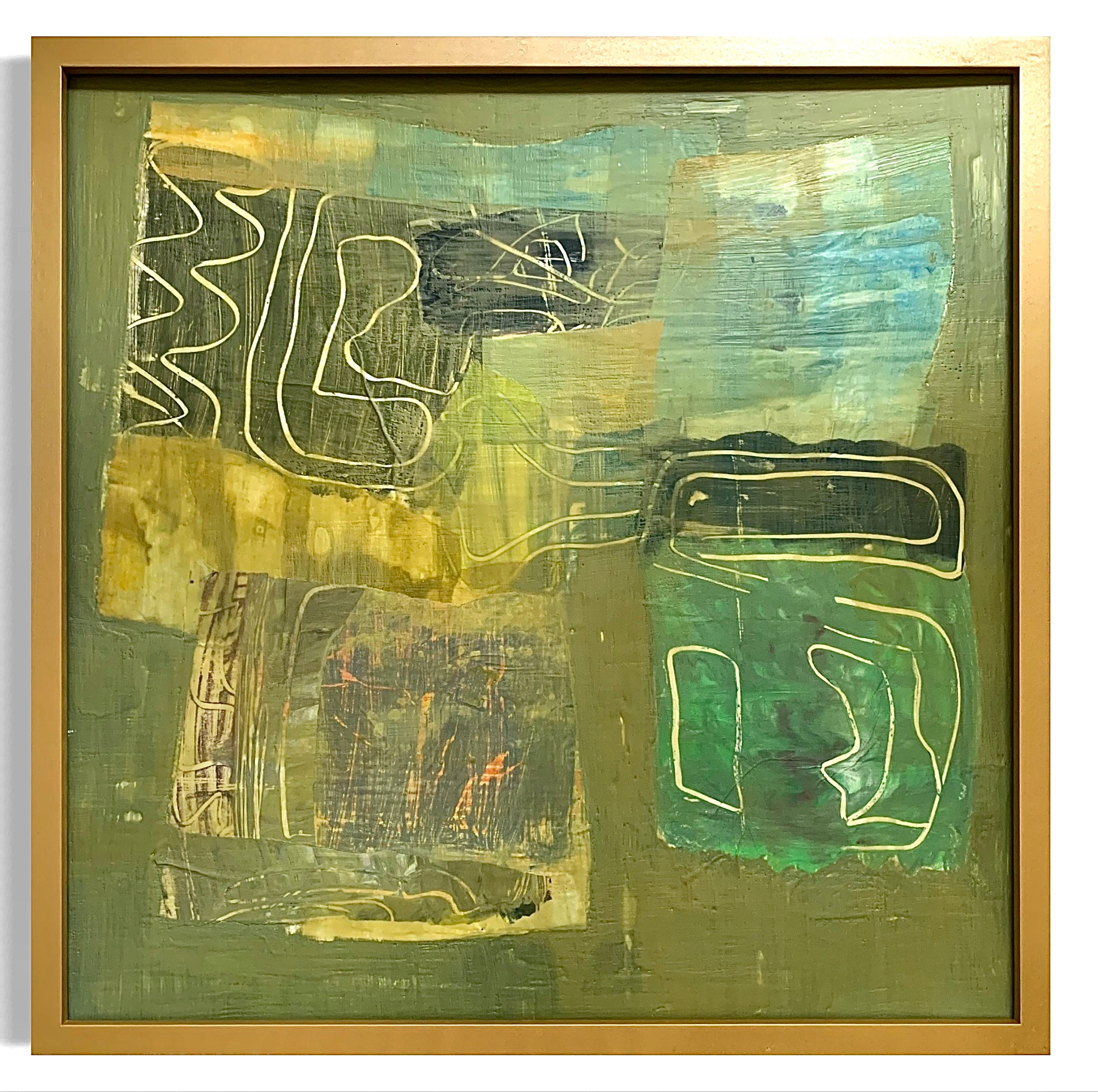 Margaret Meredith is an abstract painter working in acrylic and mixed media. Her work explores emotional atmosphere through layered surfaces, intuitive mark‑making, and a palette that balances moody, muted tones with moments of vivid color. Her recent work builds on botanical themes first explored in 2023, suggesting organic growth and memory rather than literal representation. Alongside this, Meredith has created minimalist, encaustic-medium, and collage‑based works that continue to inform her layered approach. Currently, she is focused on acrylic painting, embracing its fluidity and the freedom to work with water. Pencil marks, printed elements, stencils, and hand‑made tools play an ongoing role in her process, reflecting her love of printmaking and experimental mark‑making. Margaret Meredith lives and works in Columbus, Georgia, with her husband, a woodworker and mushroom farmer, and their two sons.