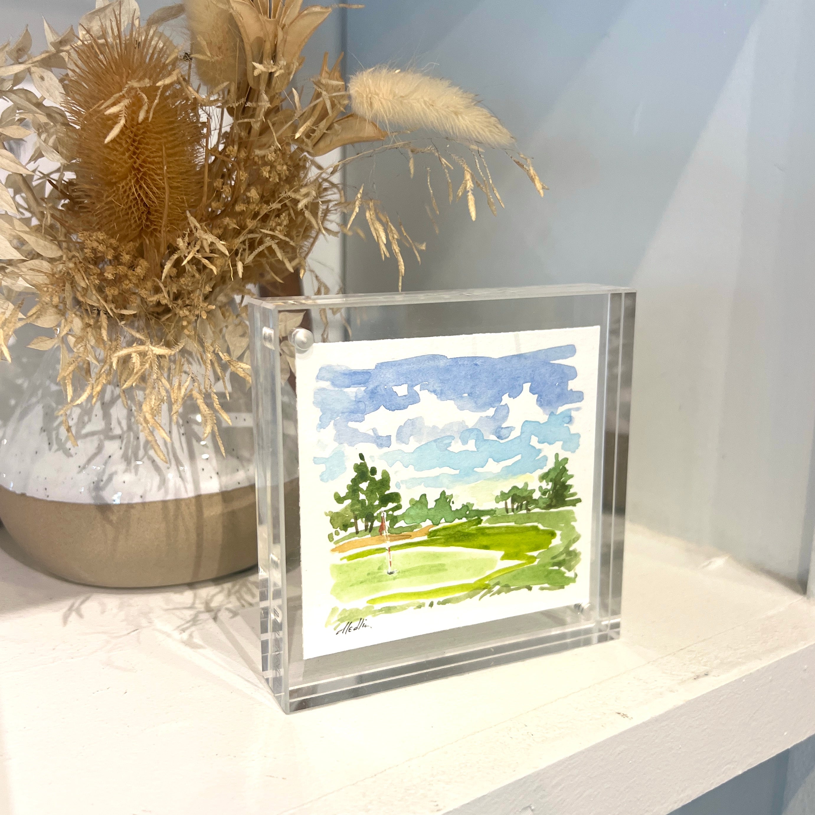 watercolor on paper, in acrylic block frame