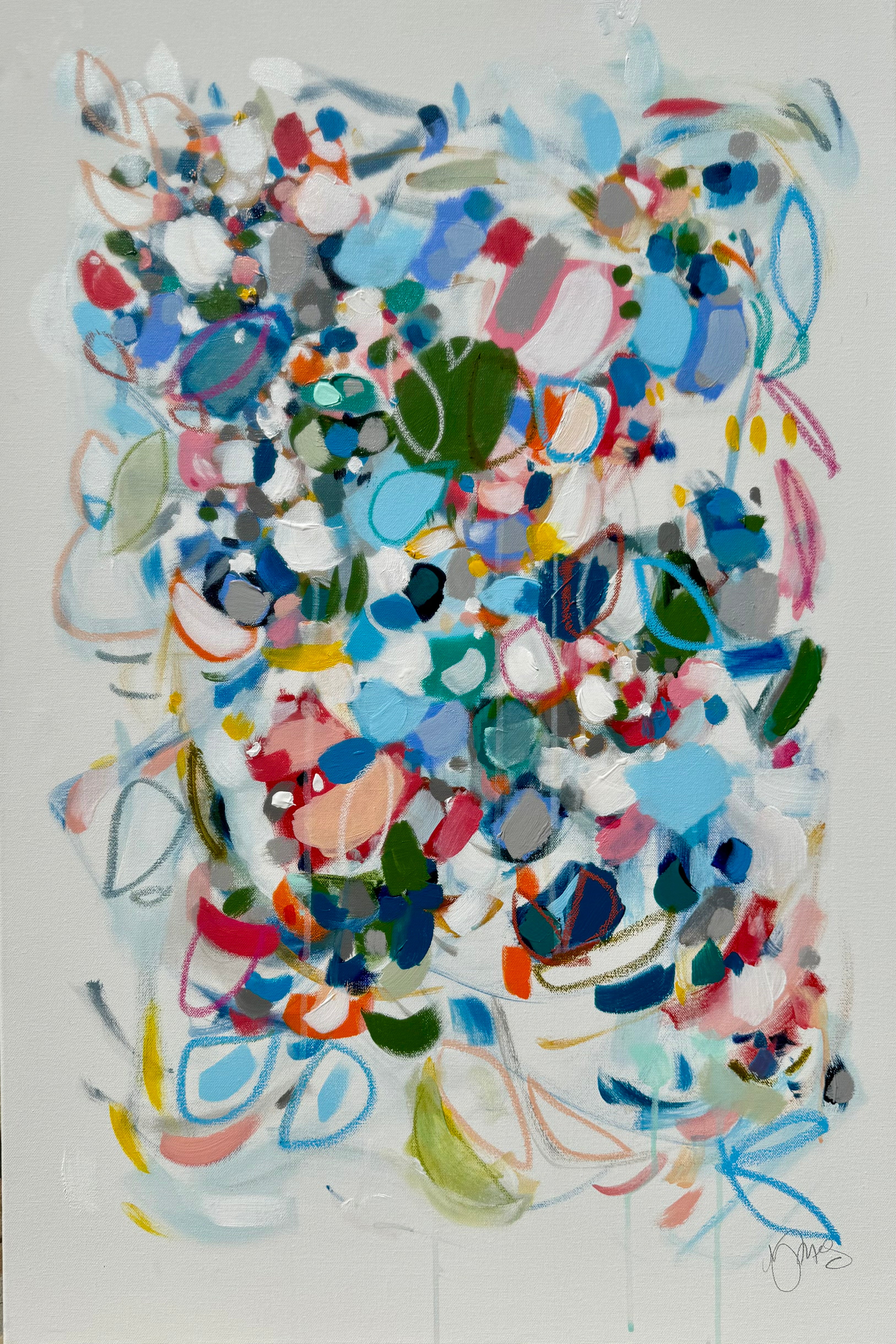 Michele James is an abstract painter known for her large works on canvas. She is inspired by color and movement and uses strong brushstroke and varied marks on neutral canvases with pops of bold colors. She paints with acrylics , and uses chalk, oil pastels and pencil to vary the texture and medium of her works. She is influenced by the colors in nature, the lightness and space of the sky, and the texture and depth of landscapes. “I love to make people happy and for a client to add my painting to their home is wonderful compliment” Michele received a BFA in fine art and art history at Hunter College in New York, NY with a concentration in studio painting. Michele paints out of her home studio in Atlanta where she lives with her husband and three kids.