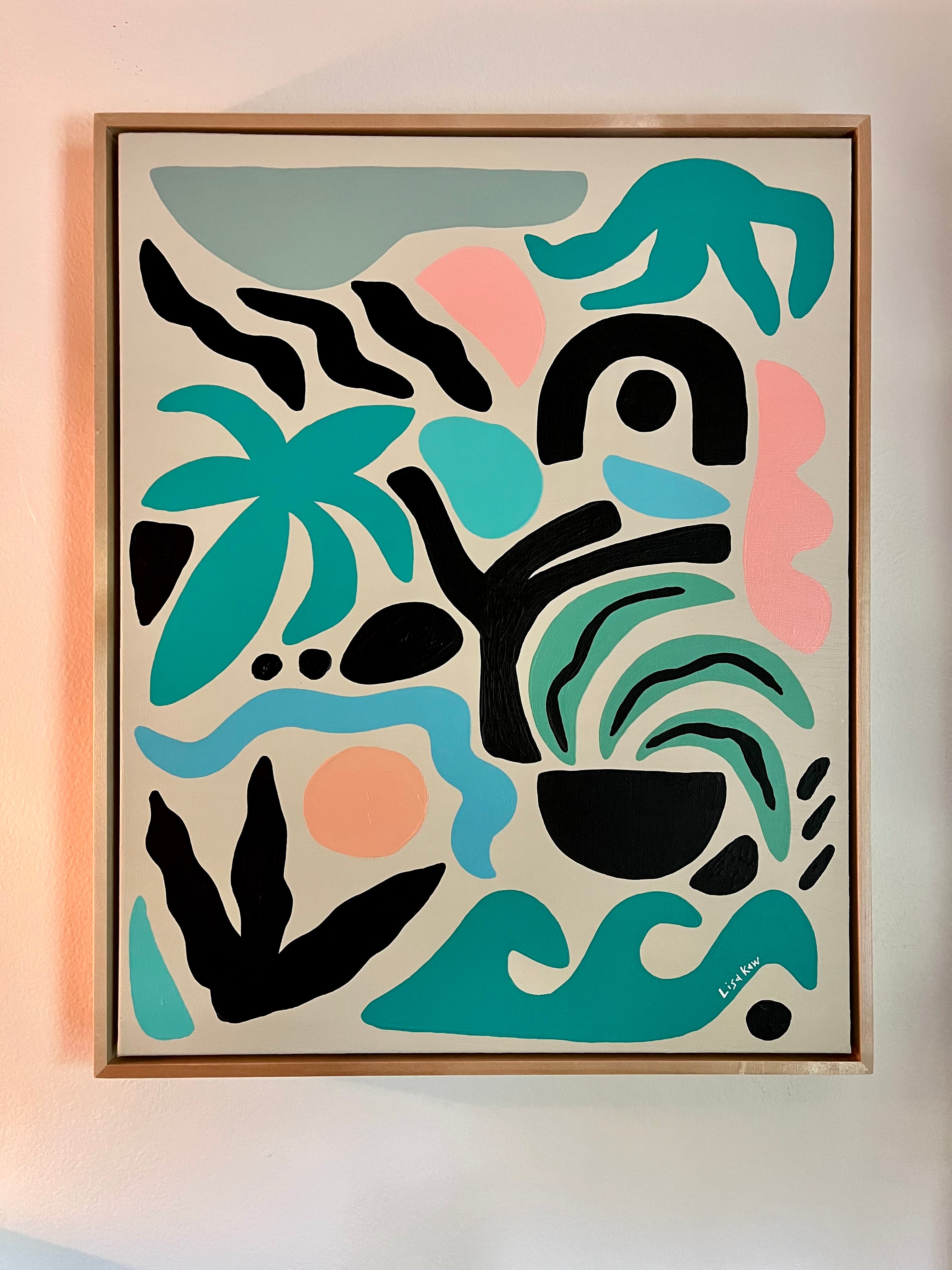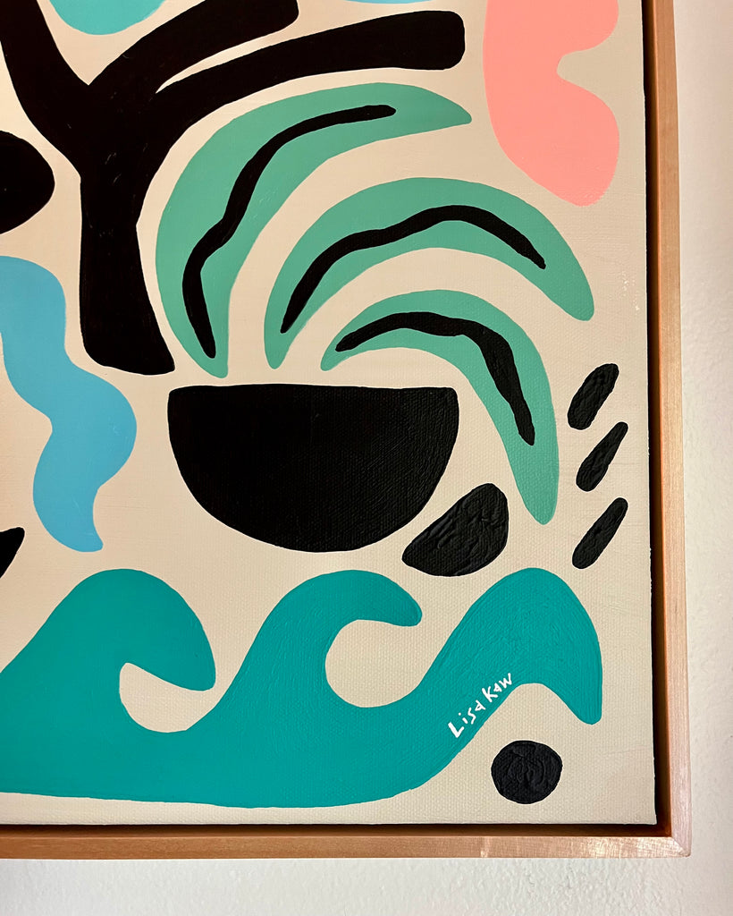 Totally tropical Lisa Kaw shares her love for nature and travel through her vibrant paintings. From her South Florida jungalow, she uses acrylic on canvas to transform the beauty around her into tangible one of a kind treasures. A minimalist at heart, Lisa thrives best when surrounded only by the blues and greens of the natural world and the curious melody of the rainforest chatter. Bali and the Big Island of Hawaii are her most sacred visited places. With a playful palette and a joyful spirit, Lisa Kaw creates work that simply and purely communicates the wonder of our natural world.