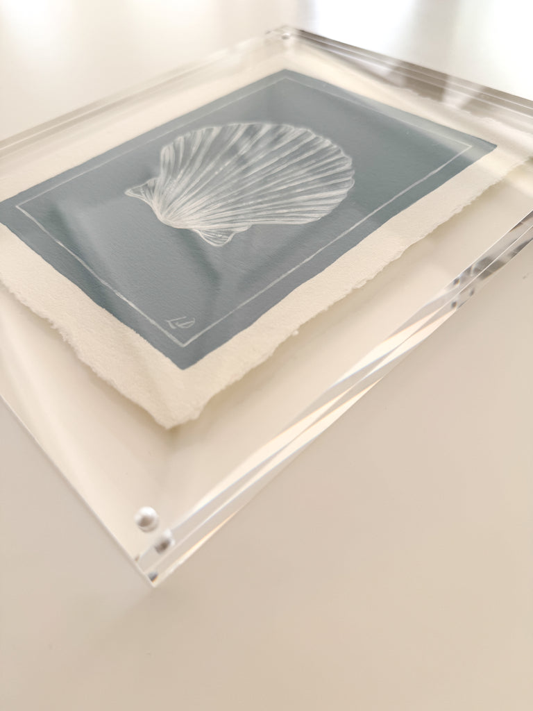 acrylic on deckled edge handmade paper, in acrylic block frame