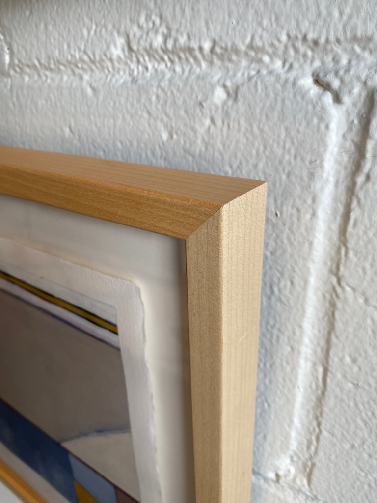 gouache and ink on deckled edge paper, floating on white mat, in maple wood frame