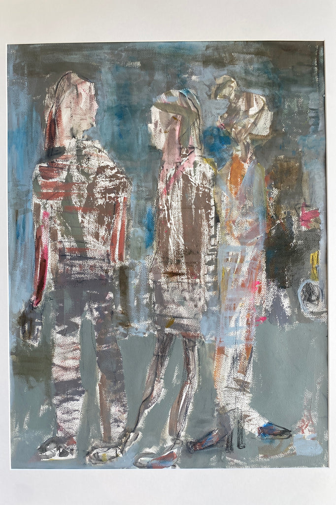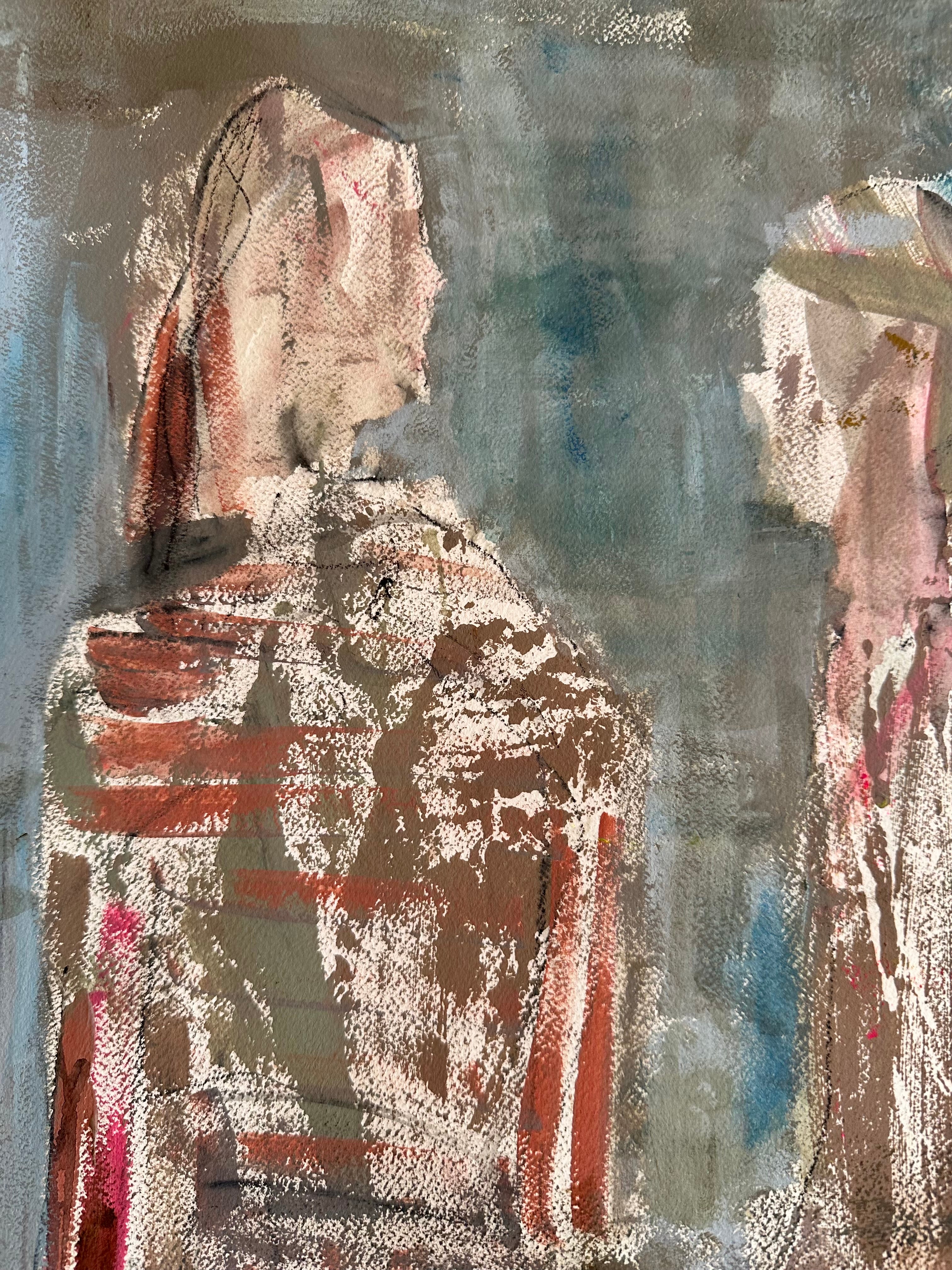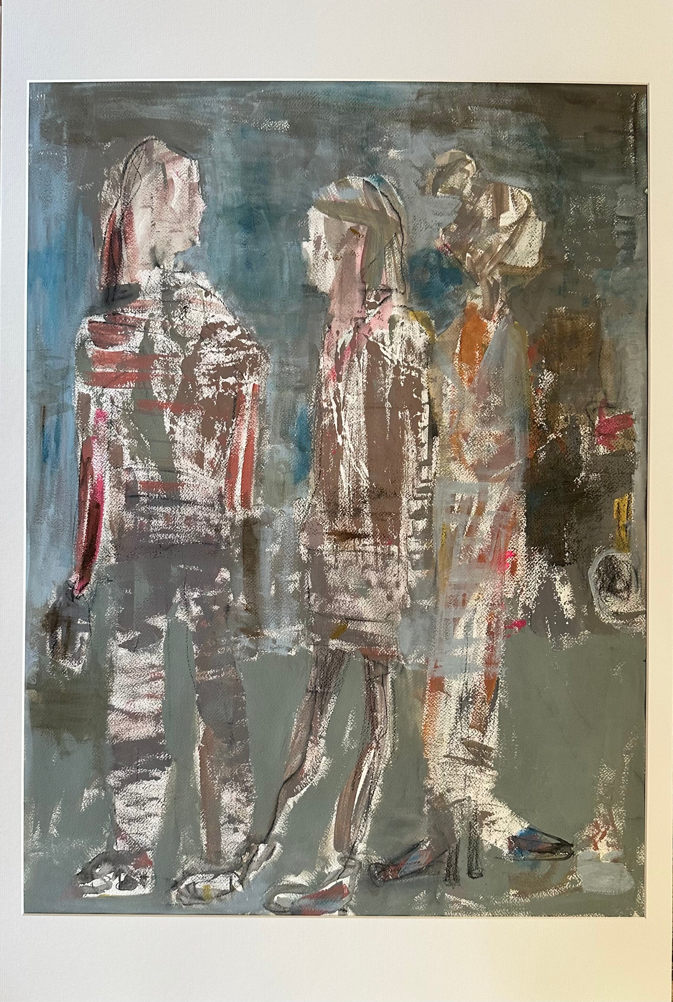 Margaret Meredith is an abstract painter working in acrylic and mixed media. Her work explores emotional atmosphere through layered surfaces, intuitive mark‑making, and a palette that balances moody, muted tones with moments of vivid color. Her recent work builds on botanical themes first explored in 2023, suggesting organic growth and memory rather than literal representation. Alongside this, Meredith has created minimalist, encaustic-medium, and collage‑based works that continue to inform her layered approach. Currently, she is focused on acrylic painting, embracing its fluidity and the freedom to work with water. Pencil marks, printed elements, stencils, and hand‑made tools play an ongoing role in her process, reflecting her love of printmaking and experimental mark‑making. Margaret Meredith lives and works in Columbus, Georgia, with her husband, a woodworker and mushroom farmer, and their two sons.