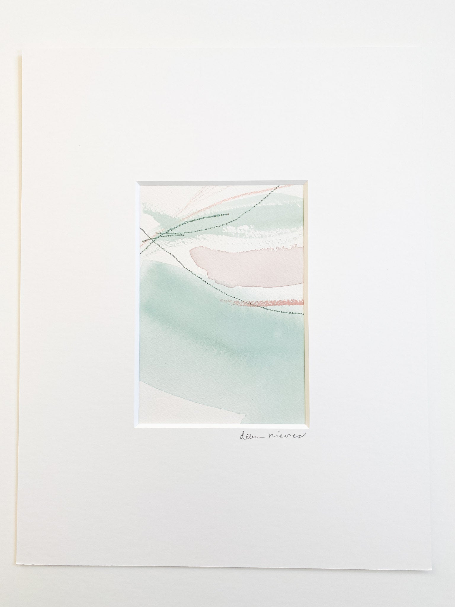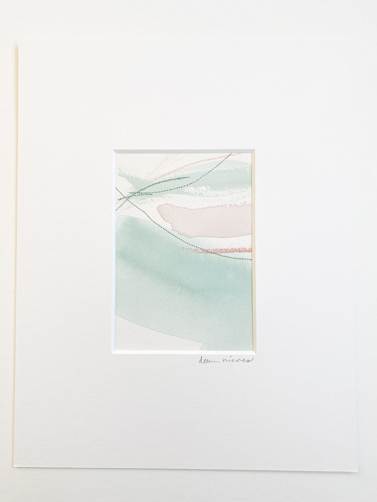 Deeann has a BFA from Memphis College of Art with a painting emphasis and has always been drawn to mixed media and collage. She took several fiber arts classes in college where she learned machine embroidery and sewing techniques. When she began working abstract a few years later, she combined these two techniques and found her own creative voice. She uses a sewing technique called free-motion machine embroidery on top of painted papers and incorporates those papers as collage.The stitched lines sit on top of fluid ink washes, colliding with bold paint scrapes and embellishing each piece with texture and delicate line, like veins running through the painting. “I am drawn to the tactility that the embroidery adds to the work both aesthetically and conceptually. The nature of thread is strong but intricate; it has a sort of permanence with the appearance of fragility.” Deeann has been in Nashville since 2018 and paints full time in her home studio with her two young daughters nearby.