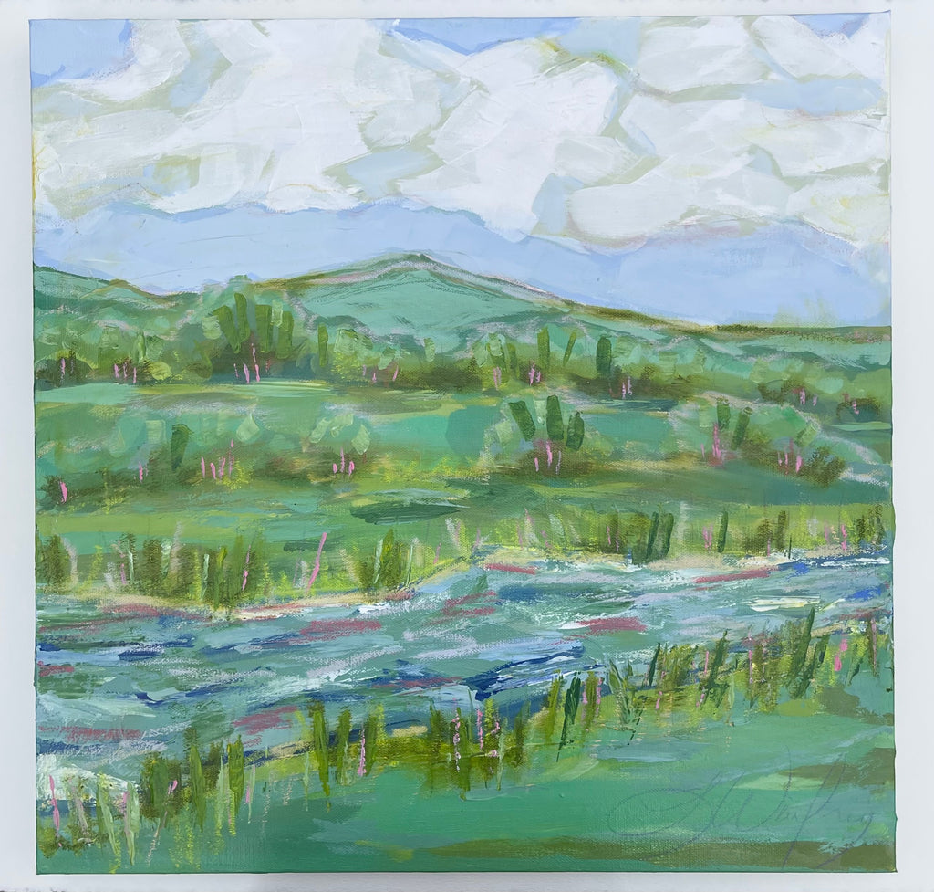 Lindsey’s paintings are an escape and journey - a time to relish the process of creativity: the brush strokes, the layers, the juxtaposition of colors. She works primarily with acrylic paints for their intensity of color and the ability to layer and create textures with various acrylic mediums and gels. A native of Lynchburg, Virginia, Lindsey’s landscapes generally focus on special places that she has known all her life, including fields at the foot of the Blue Ridge Mountains and the pristine beauty of the Cowpasture River. Working from onsite sketches and photographs, she mixes observations with her own personal memories and feelings of how she perceives a place. In addition to being an artist, Lindsey is a full-time art educator, wife, and mother of two young children.
