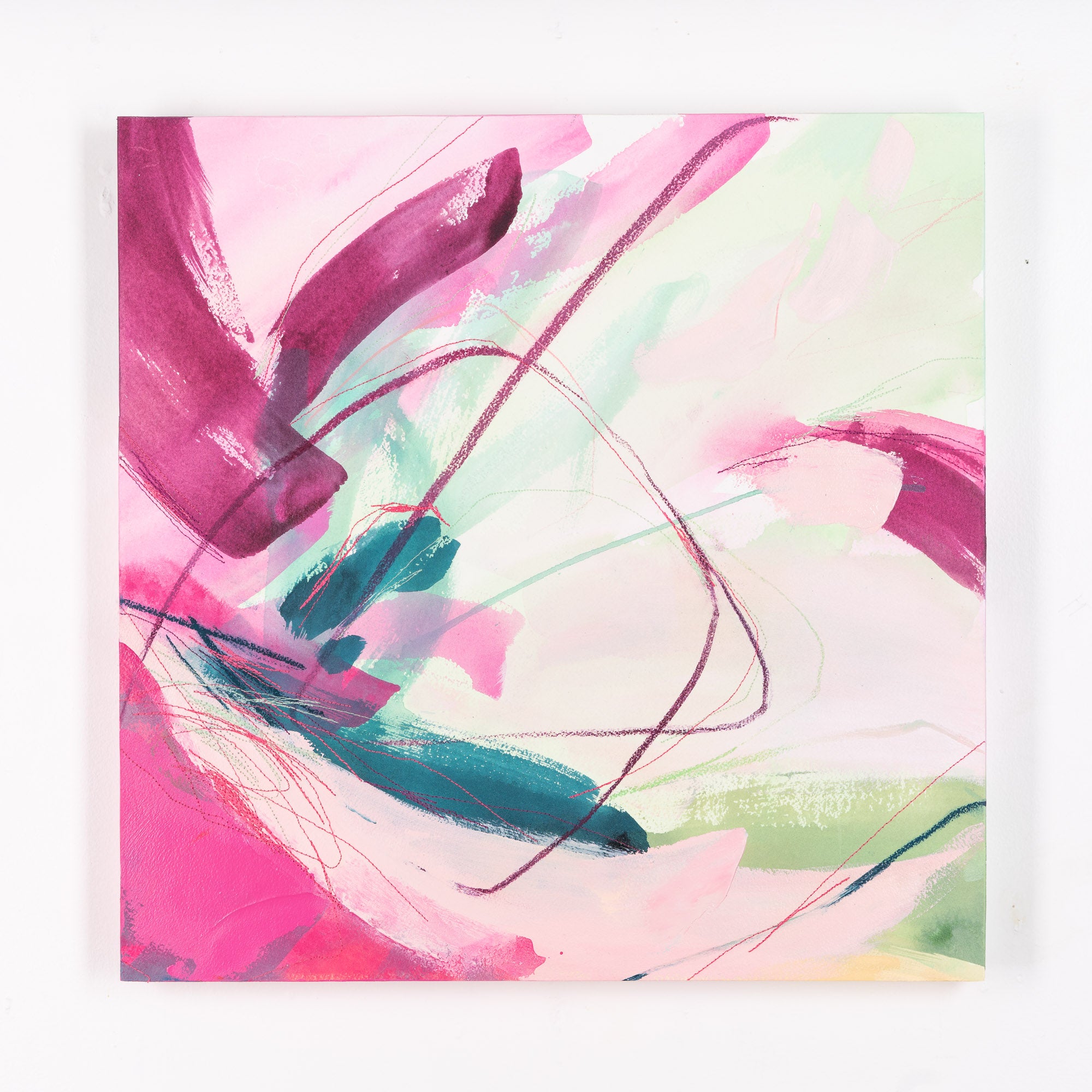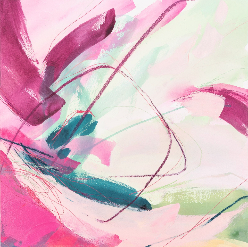Deeann has a BFA from Memphis College of Art with a painting emphasis and has always been drawn to mixed media and collage. She took several fiber arts classes in college where she learned machine embroidery and sewing techniques. When she began working abstract a few years later, she combined these two techniques and found her own creative voice. She uses a sewing technique called free-motion machine embroidery on top of painted papers and incorporates those papers as collage.The stitched lines sit on top of fluid ink washes, colliding with bold paint scrapes and embellishing each piece with texture and delicate line, like veins running through the painting. “I am drawn to the tactility that the embroidery adds to the work both aesthetically and conceptually. The nature of thread is strong but intricate; it has a sort of permanence with the appearance of fragility.” Deeann has been in Nashville since 2018 and paints full time in her home studio with her two young daughters nearby.