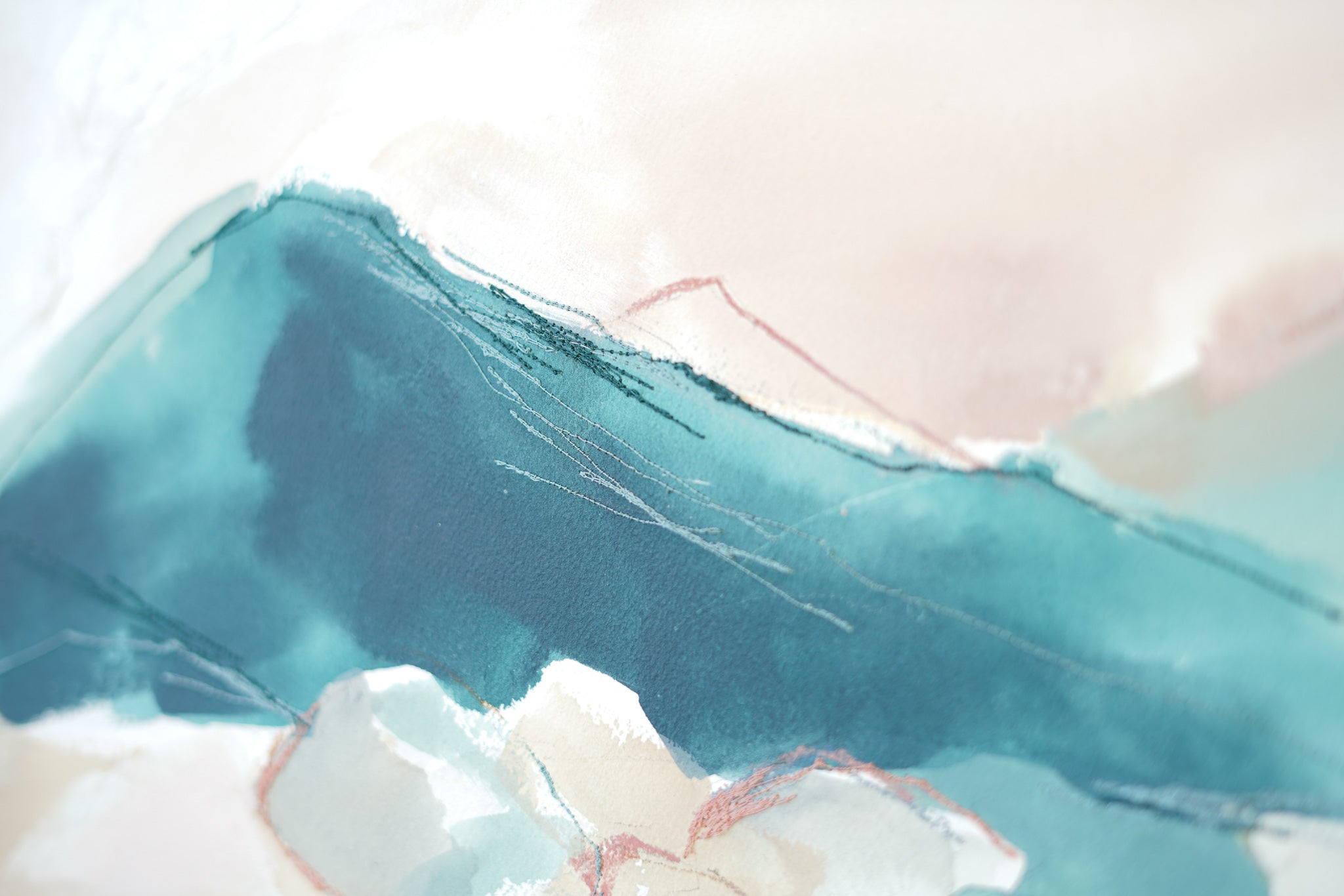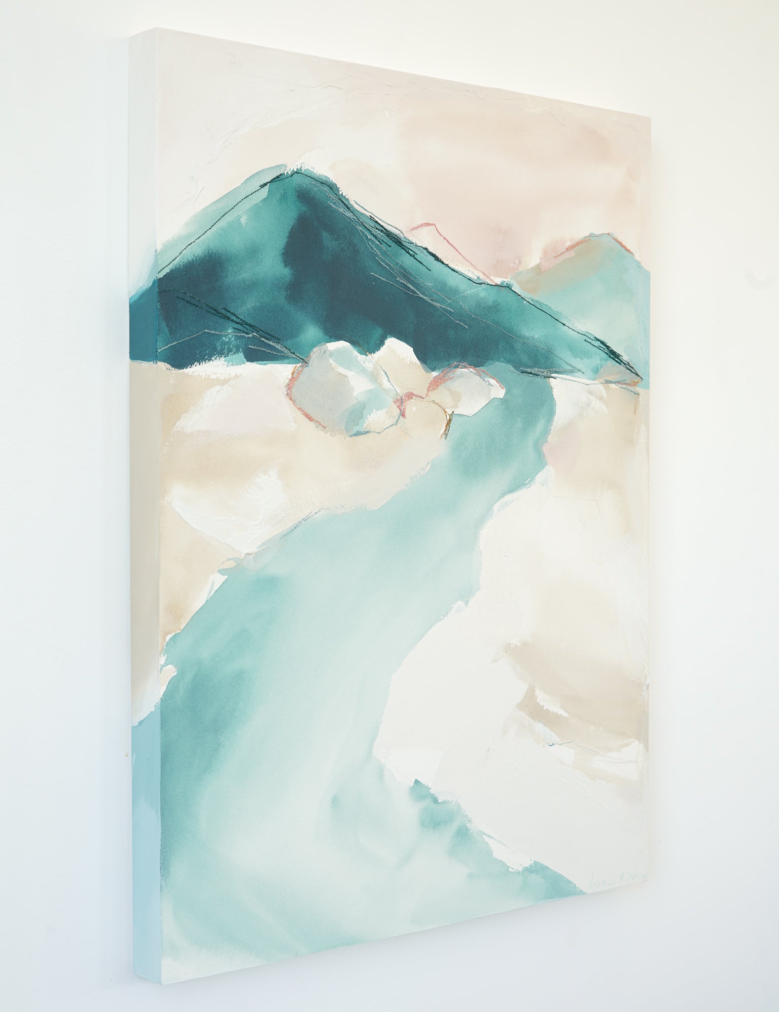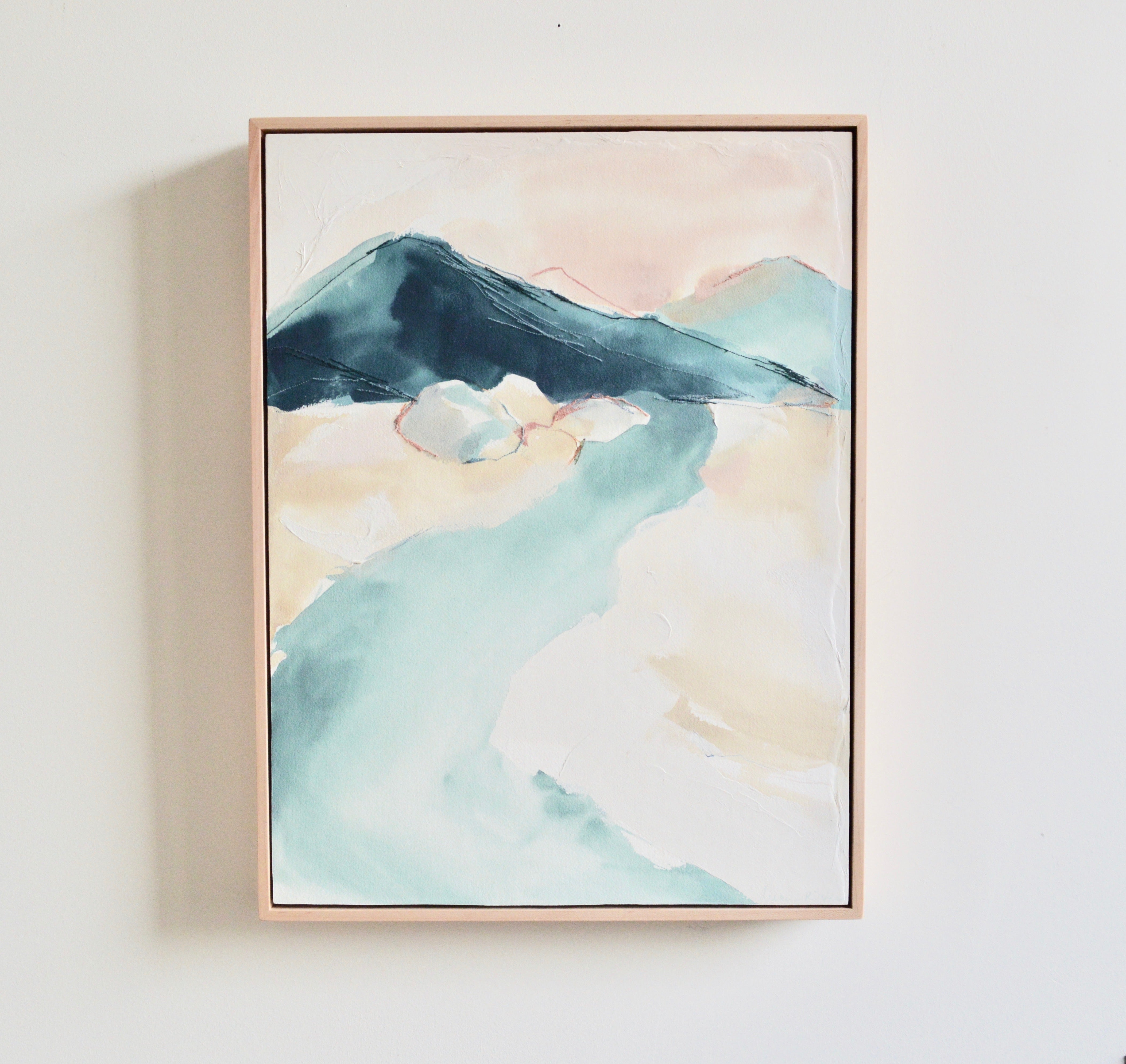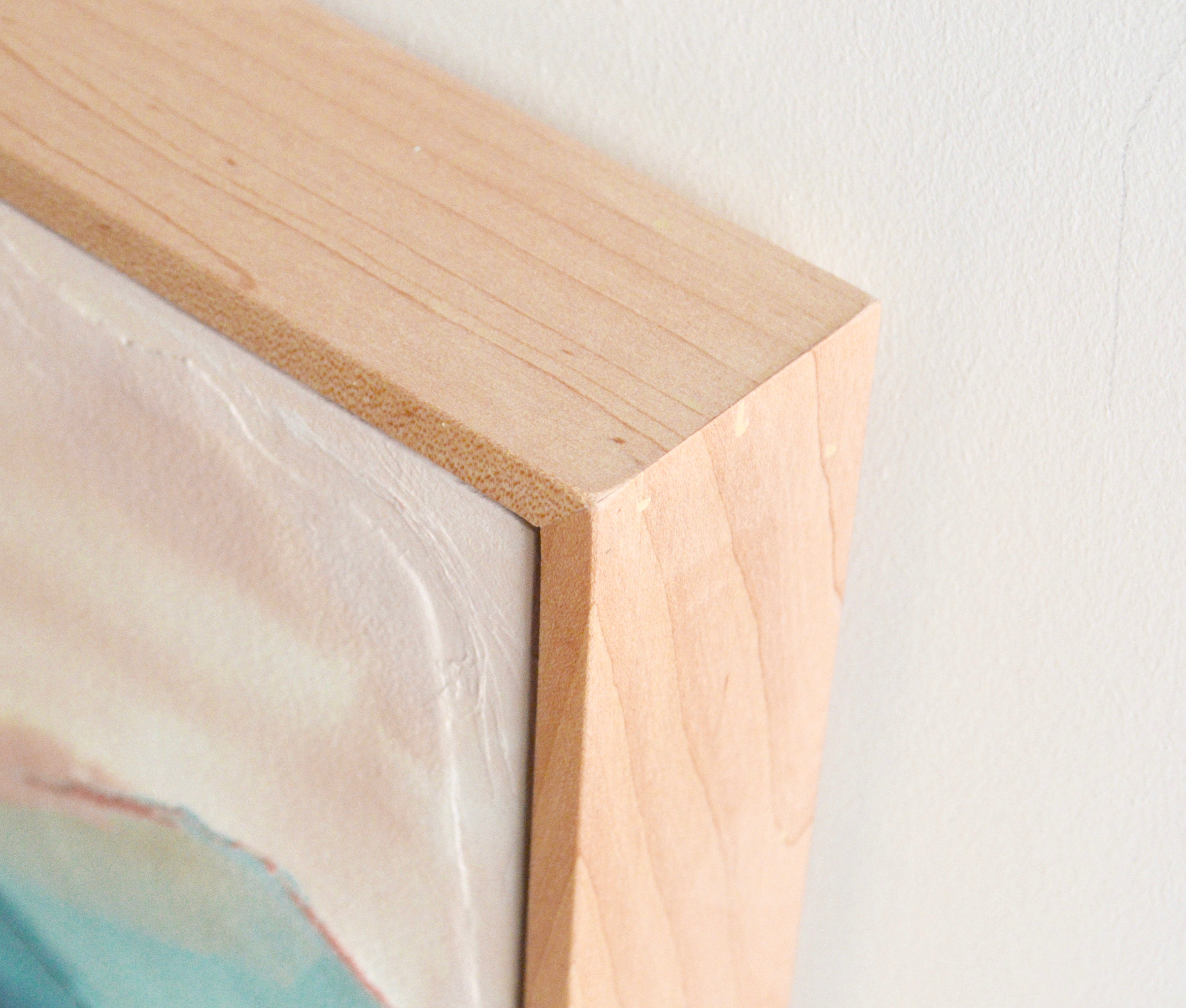 mixed media on cradled wood panel, framed in natural wood frame