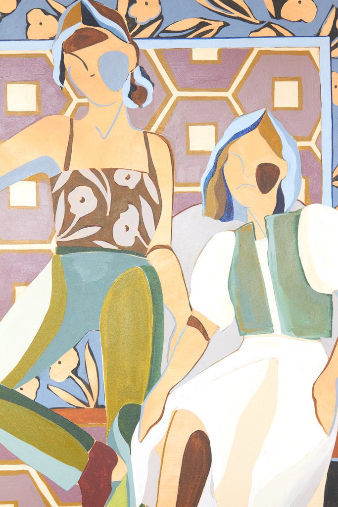 My name is Lizzy Love and I'm an artist in Nashville, TN. I create figurative works on canvas with acrylic paint and papers with watercolor and gouache. This body of work has been a rebirth for me creatively. While I've been painting full time for the last 5 years, I feel like I've really come into myself creatively with my figurative paintings. Born out of a time of uncertainty and lots of questioning, I was pushed to dig deep and get back to basics. I decided to switch gears from painting the landscapes, for which I had been primarily making for years. As an effort to get my creative spark back, I started sketching figures from magazines, a subject I hadn’t explored in a long time. Over many months they slowly evolved into what they have become; starting from detailed and realistic, to more abstract and modernist. I am a big believer that the environment of your home shapes your attitude, and for that reason I love interior design. That love is what led me to start incorporating furniture / interior surroundings / and patterns into the pieces. I pull apart and put back together the lines and shapes of many of my favorite interiors, and place them amongst the figures in a dynamic way. These ladies embody many things - community, respect, femininity, reverence. They are a way to draw attention to what being a woman entails. Many times it means being fierce and strong. Many times it means leaning on and drawing your strength from friends that are like family. While creating each piece, I draw upon the love and reverence I have for all the women in my life; the women who have shaped me, lifted me up when I needed it, laughed with me, and inspired me.