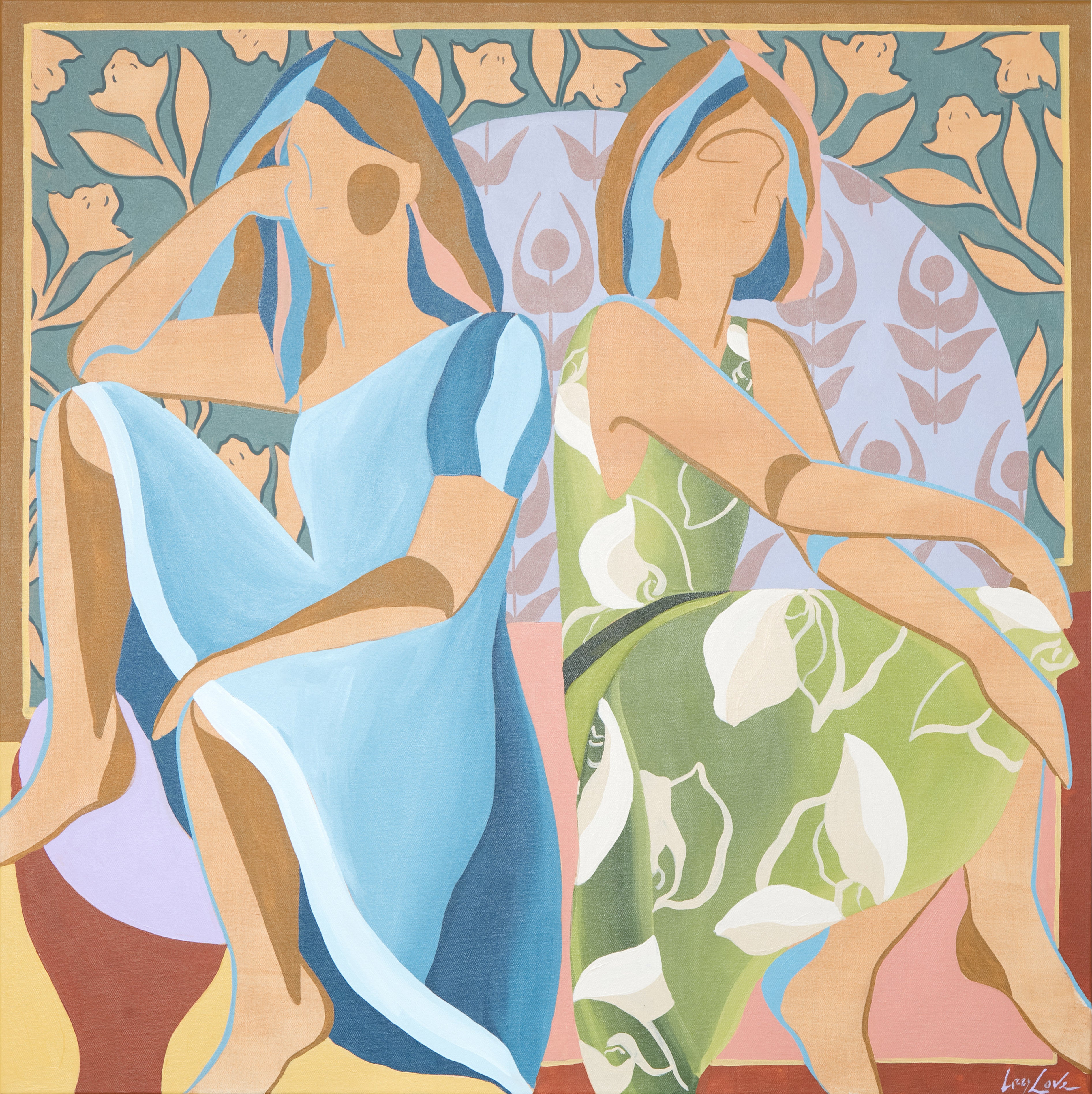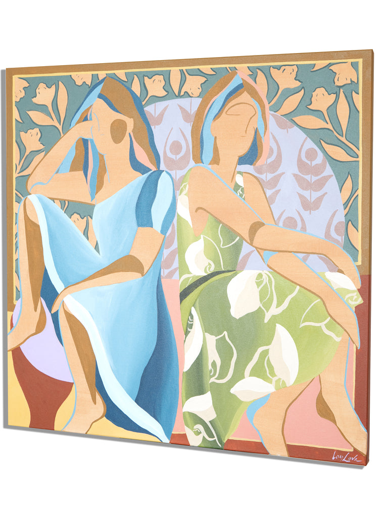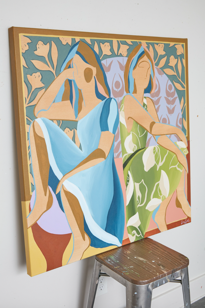 My name is Lizzy Love and I'm an artist in Nashville, TN. I create figurative works on canvas with acrylic paint and papers with watercolor and gouache. This body of work has been a rebirth for me creatively. While I've been painting full time for the last 5 years, I feel like I've really come into myself creatively with my figurative paintings. Born out of a time of uncertainty and lots of questioning, I was pushed to dig deep and get back to basics. I decided to switch gears from painting the landscapes, for which I had been primarily making for years. As an effort to get my creative spark back, I started sketching figures from magazines, a subject I hadn’t explored in a long time. Over many months they slowly evolved into what they have become; starting from detailed and realistic, to more abstract and modernist. I am a big believer that the environment of your home shapes your attitude, and for that reason I love interior design. That love is what led me to start incorporating furniture / interior surroundings / and patterns into the pieces. I pull apart and put back together the lines and shapes of many of my favorite interiors, and place them amongst the figures in a dynamic way. These ladies embody many things - community, respect, femininity, reverence. They are a way to draw attention to what being a woman entails. Many times it means being fierce and strong. Many times it means leaning on and drawing your strength from friends that are like family. While creating each piece, I draw upon the love and reverence I have for all the women in my life; the women who have shaped me, lifted me up when I needed it, laughed with me, and inspired me.