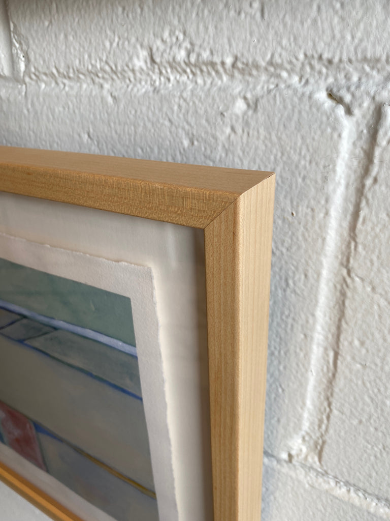 gouache and ink on deckled edge paper, floating on white mat, in maple wood frame