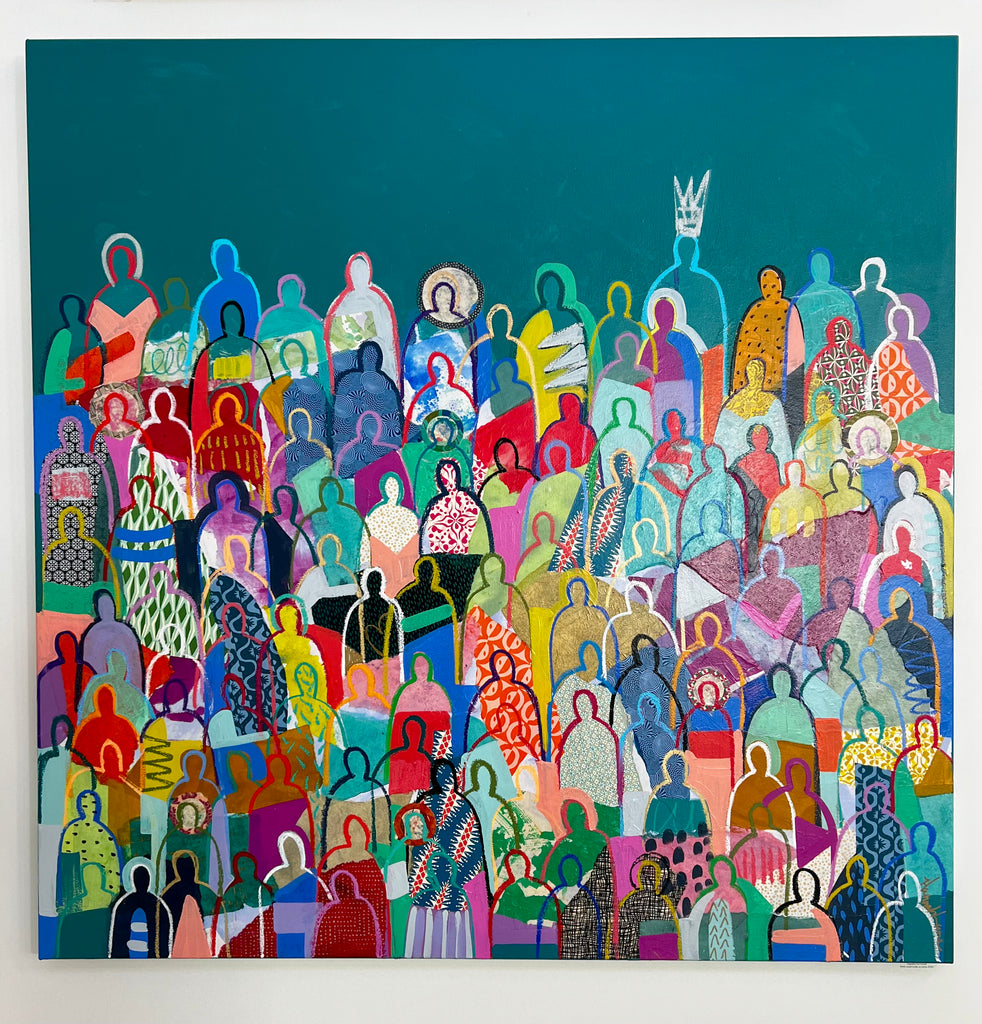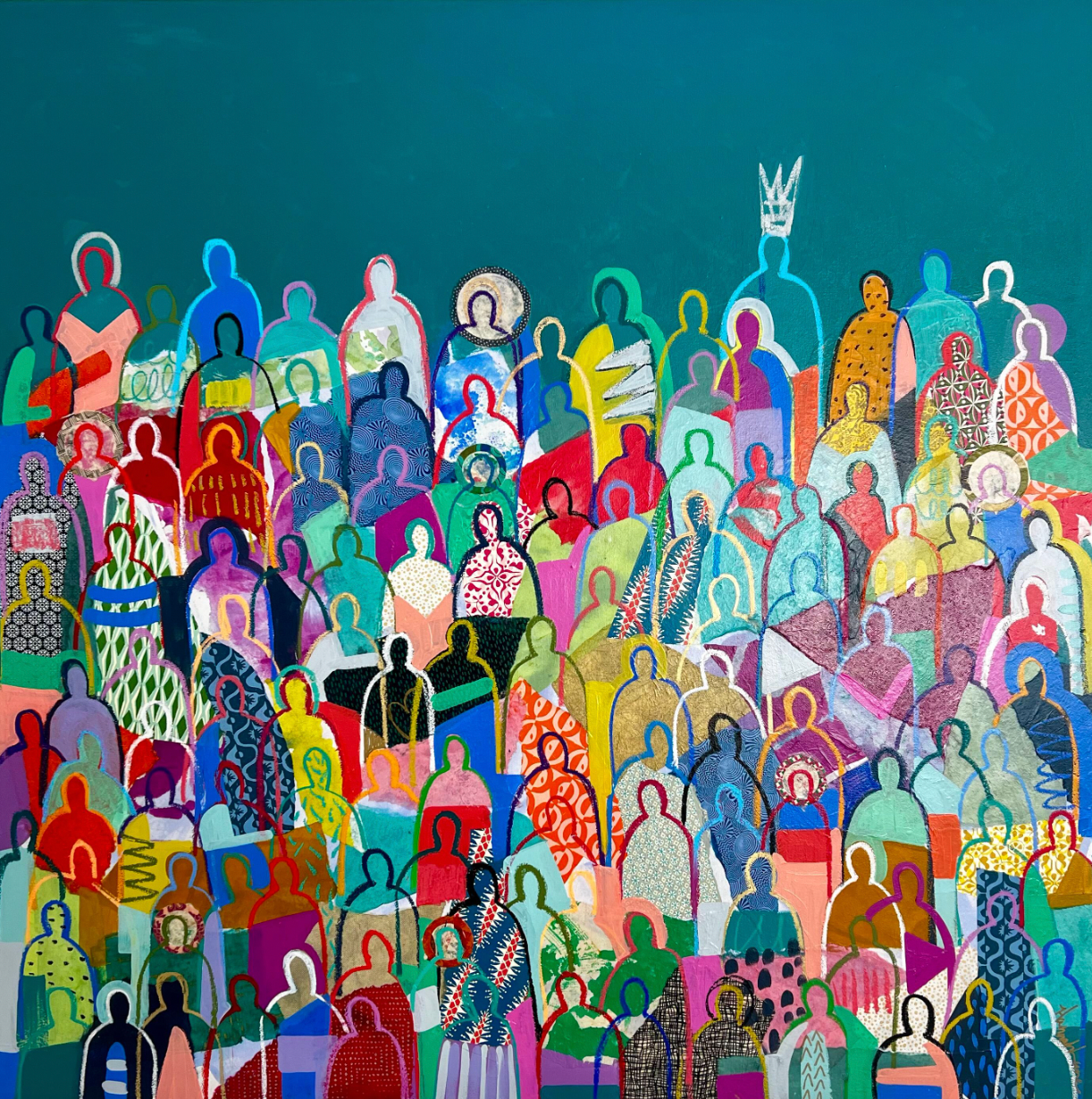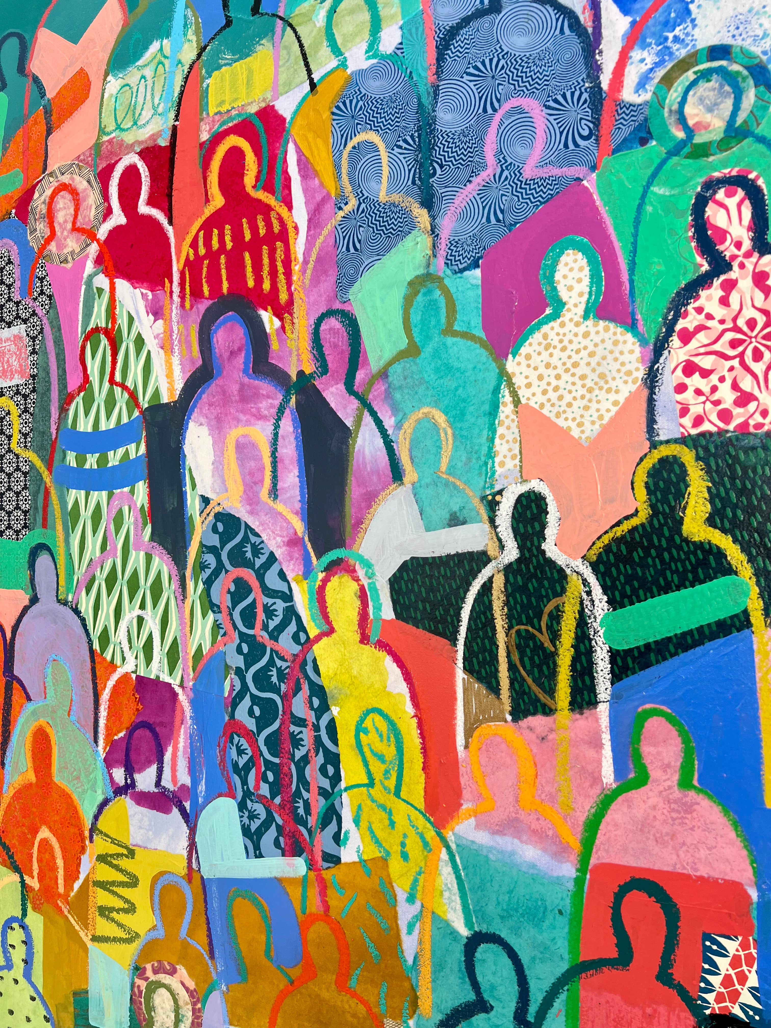 Hannah Lane is a contemporary mixed media artist celebrated for her bold use of color and dynamic, collage-like layering. A Louisiana native and graduate of the Savannah College of Art & Design, Hannah draws deep inspiration from the vibrant landscapes, diverse cultures, and heartfelt sense of family and community found in her southern roots. Her work blends pigmented Japanese papers, expressive line work, and rich washes of acrylic paint to create textured, energetic paintings. Each collection reflects her love for nature, storytelling, and community—an invitation to explore the beauty of her inner imagination. Hannah is represented by some of the top galleries in the Southeast, and her paintings are collected privately and in corporate spaces across the country. She also loves working one-on-one with collectors to create meaningful, custom pieces. After living and painting in Italy and New Orleans, Hannah now calls Nashville home, where she is part of a thriving art community. When she’s not painting in her home studio, you’ll find Hannah hiking with her boys, reading, or cooking up something seasonal and delicious! The crowd series is one of my most iconic collections, inspired by my big, beautiful Louisiana family and the joyful spirit of southern gatherings. I grew up surrounded by cousins, friends, and neighbors—many from families as large and lively as my own—where faith and family were at the heart of everything. Over the past 12 years, this series has evolved with new patterns, papers, and symbols that reflect the changing seasons of life. Each crowd painting is a kind of meditation, a reflection on the deep truth that we’re all connected. Rich with personal symbols and intuitive mark-making, these pieces push the boundaries of mixed media and invite you to see something familiar in a new way. Whether you're drawn to the vibrant energy, the quiet details, or the sense of belonging they evoke, each crowd carries its own unique aura—waiting for the right person to bring it home.