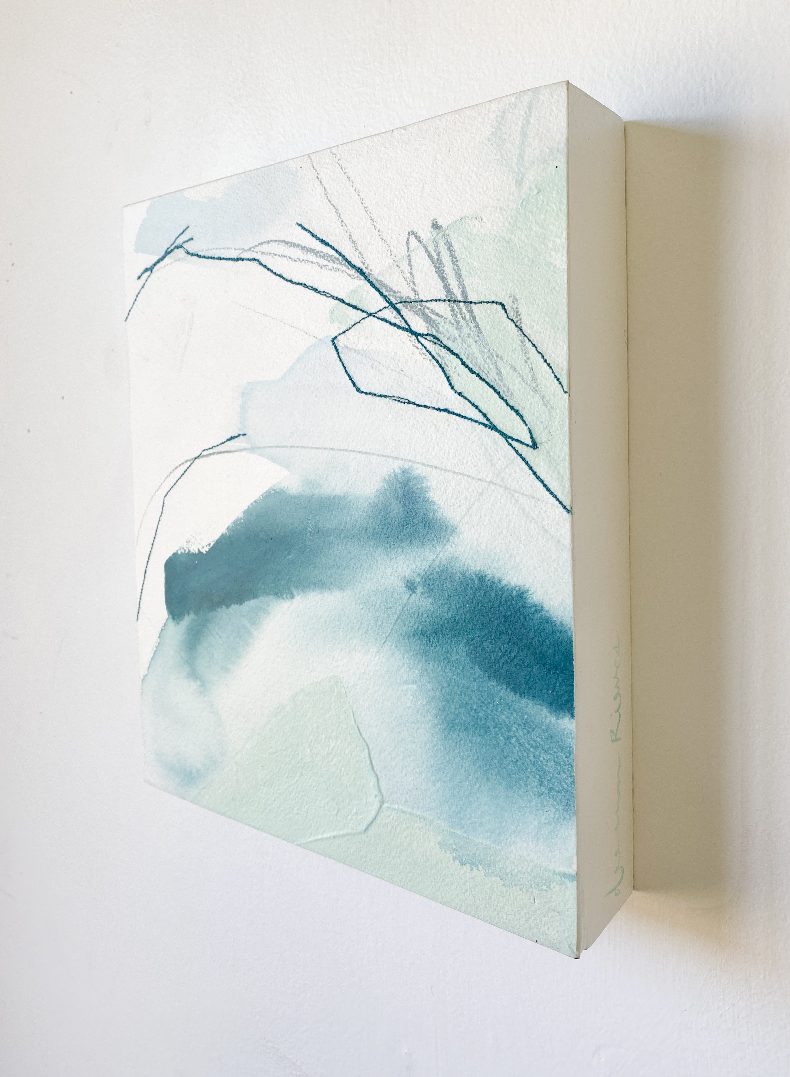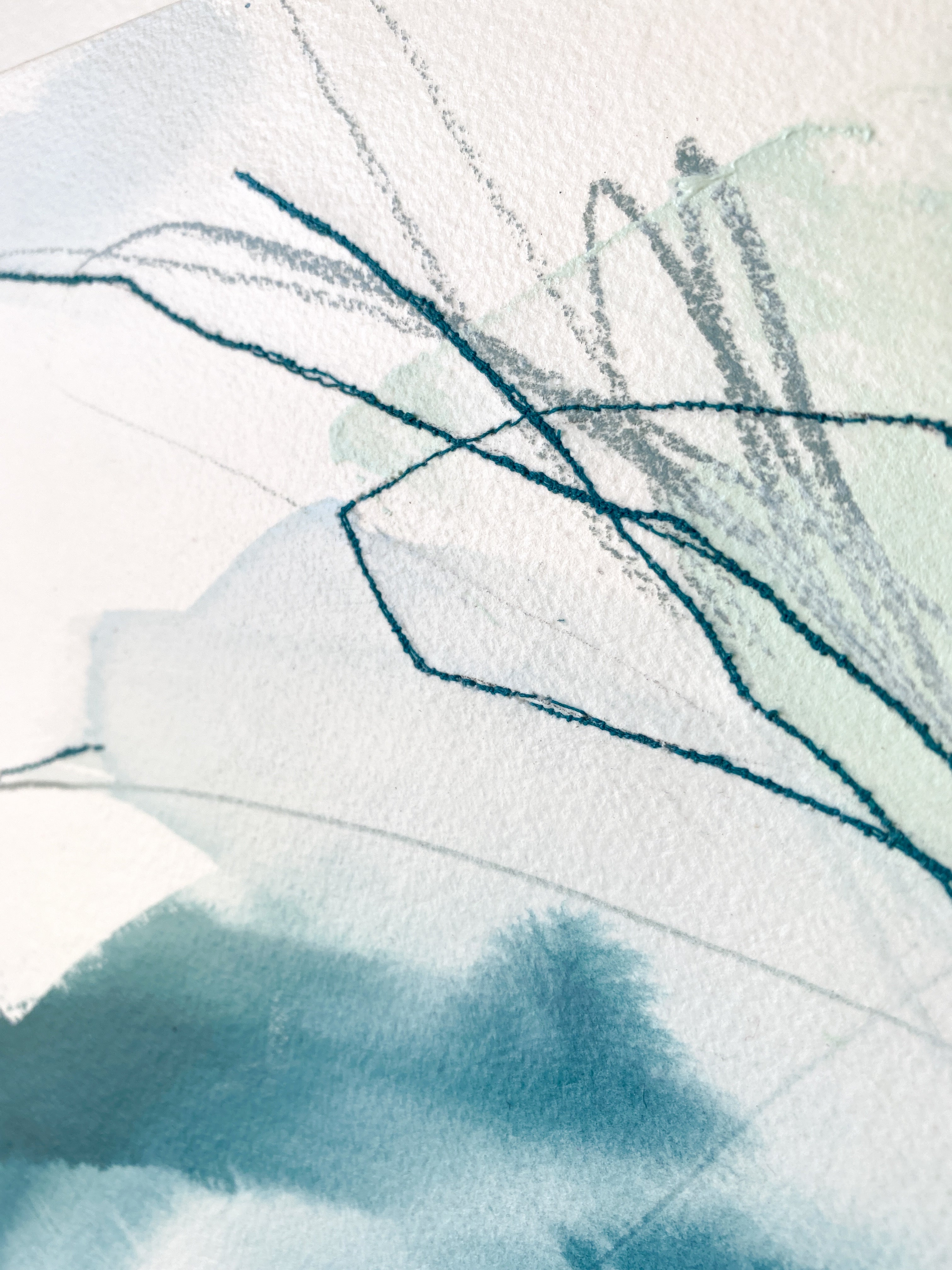 Deeann has a BFA from Memphis College of Art with a painting emphasis and has always been drawn to mixed media and collage. She took several fiber arts classes in college where she learned machine embroidery and sewing techniques. When she began working abstract a few years later, she combined these two techniques and found her own creative voice. She uses a sewing technique called free-motion machine embroidery on top of painted papers and incorporates those papers as collage.The stitched lines sit on top of fluid ink washes, colliding with bold paint scrapes and embellishing each piece with texture and delicate line, like veins running through the painting. “I am drawn to the tactility that the embroidery adds to the work both aesthetically and conceptually. The nature of thread is strong but intricate; it has a sort of permanence with the appearance of fragility.” Deeann has been in Nashville since 2018 and paints full time in her home studio with her two young daughters nearby.