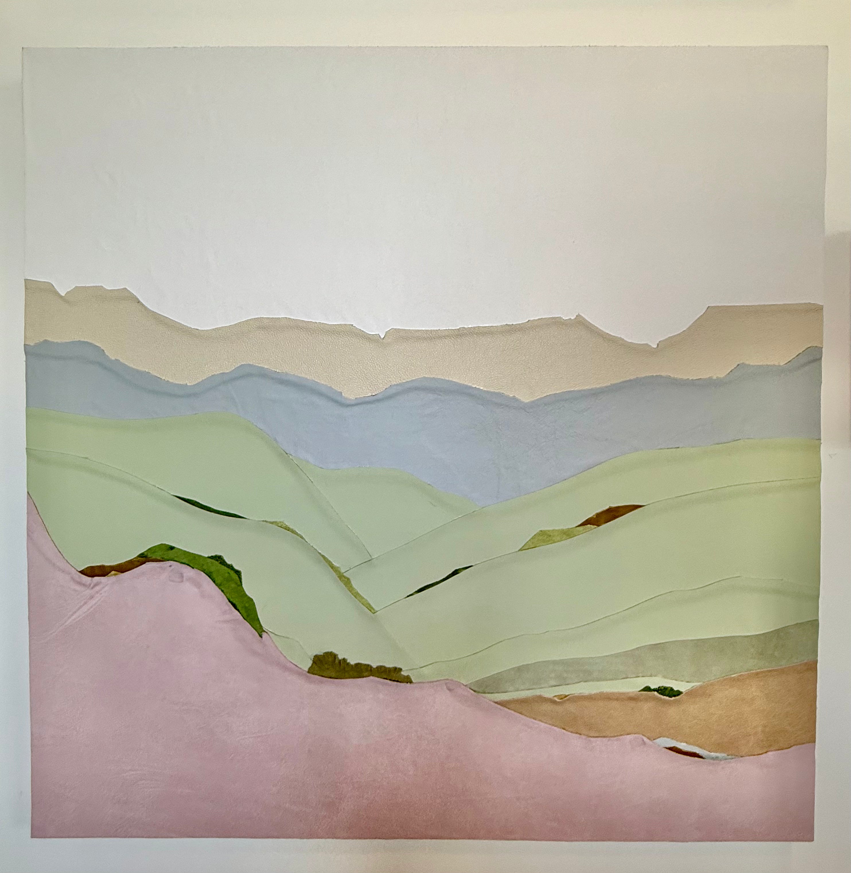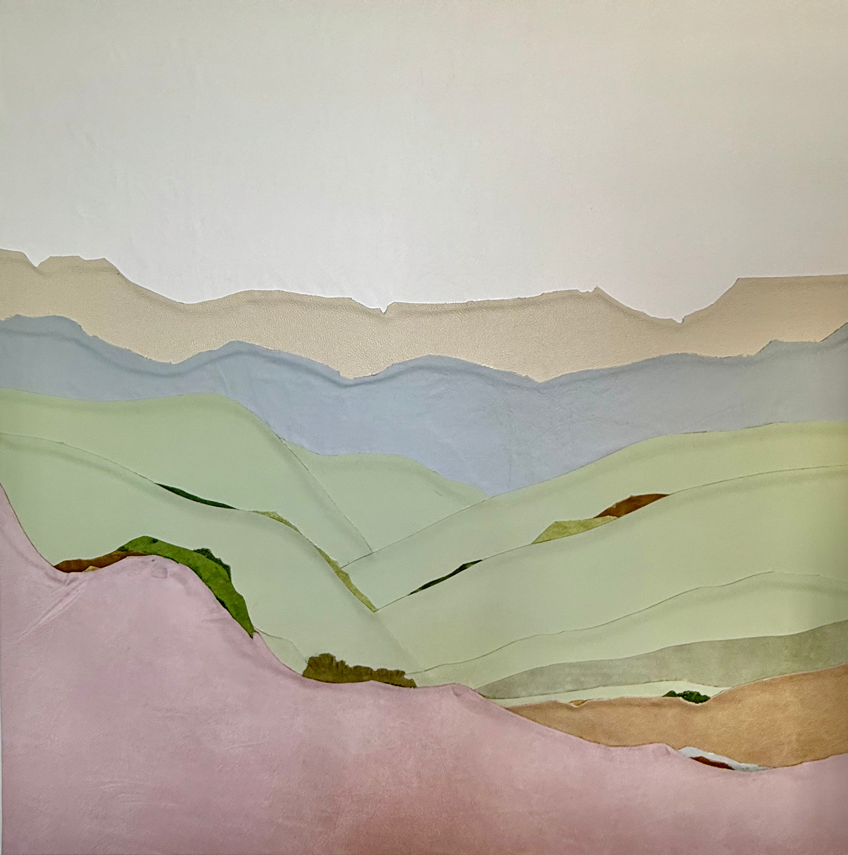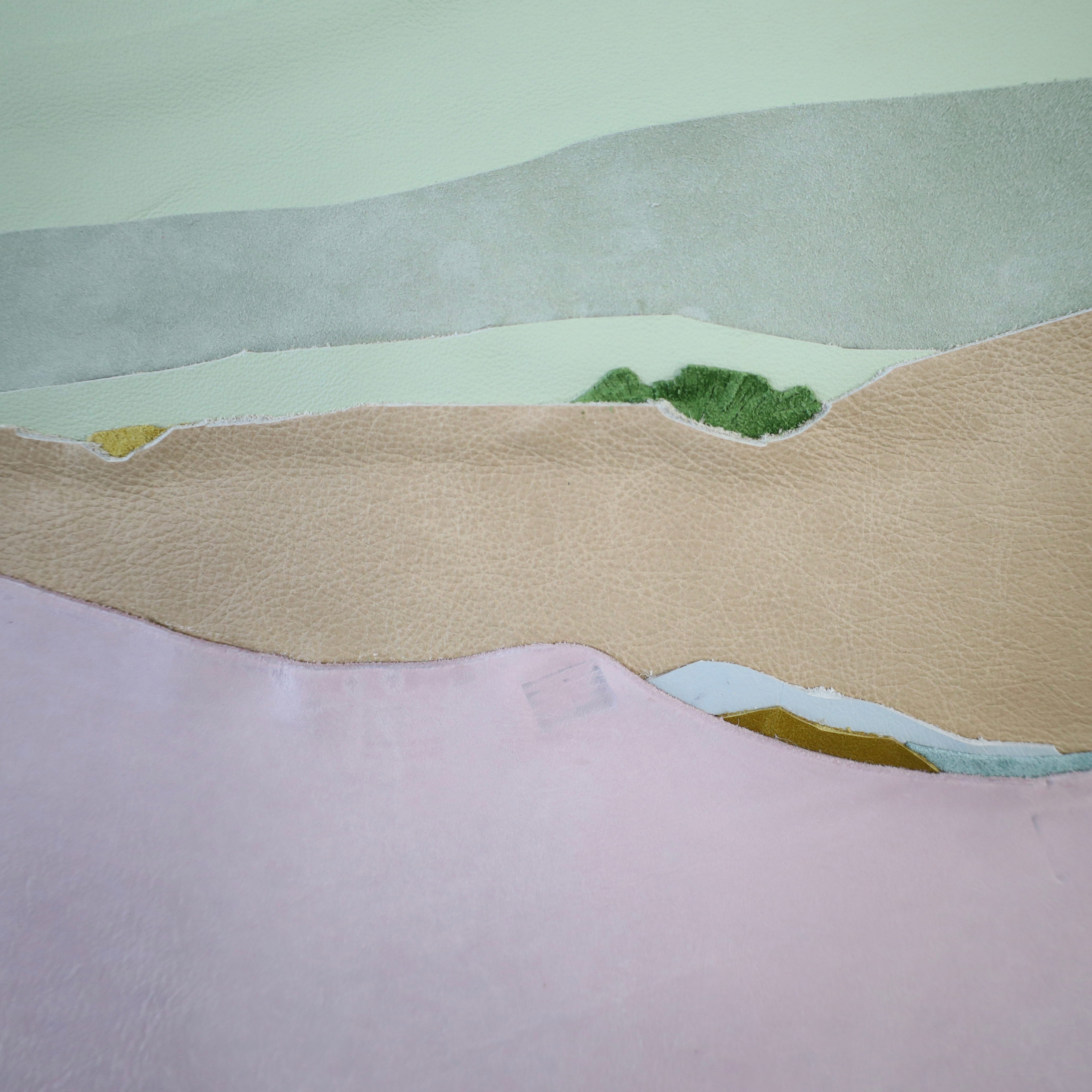 My passion as an artist comes from a life-long desire to create. Growing up with a parent in the military, I was consistently moving around from one place to the next, all the while collecting shapes, places and colors to put in my back pocket and one day use. I was always a painter but started to expand my idea of what could and couldn't be used as art in high school and continued until I finally found my material of choice while in college doing a project made of scrap textiles, including leather and other recycled materials. Years later, in 2018, I started my embarkment as an artist experimenting with different mediums and textiles that slowly evolved into my primary use of leather today. Currently, I live in Memphis, Tennessee with my husband, Alan, and our child, Arrison. When I'm not in the studio, we are often found enjoying local parks, taking nature walks led by our little one. Inspired by the landscapes I grew up seeing and my travels, I soak in my surroundings and then illustrate them in my own way through collages. I am always mesmerized with the way the calming colors and soft layered textures of my pieces can speak to others without using words. A little leather on a wooden panel creates a shared experience between you, the viewer, and me, the artist. This connection brings me such joy and compels me to create the way I see the world: full of color and unsuspecting textures.