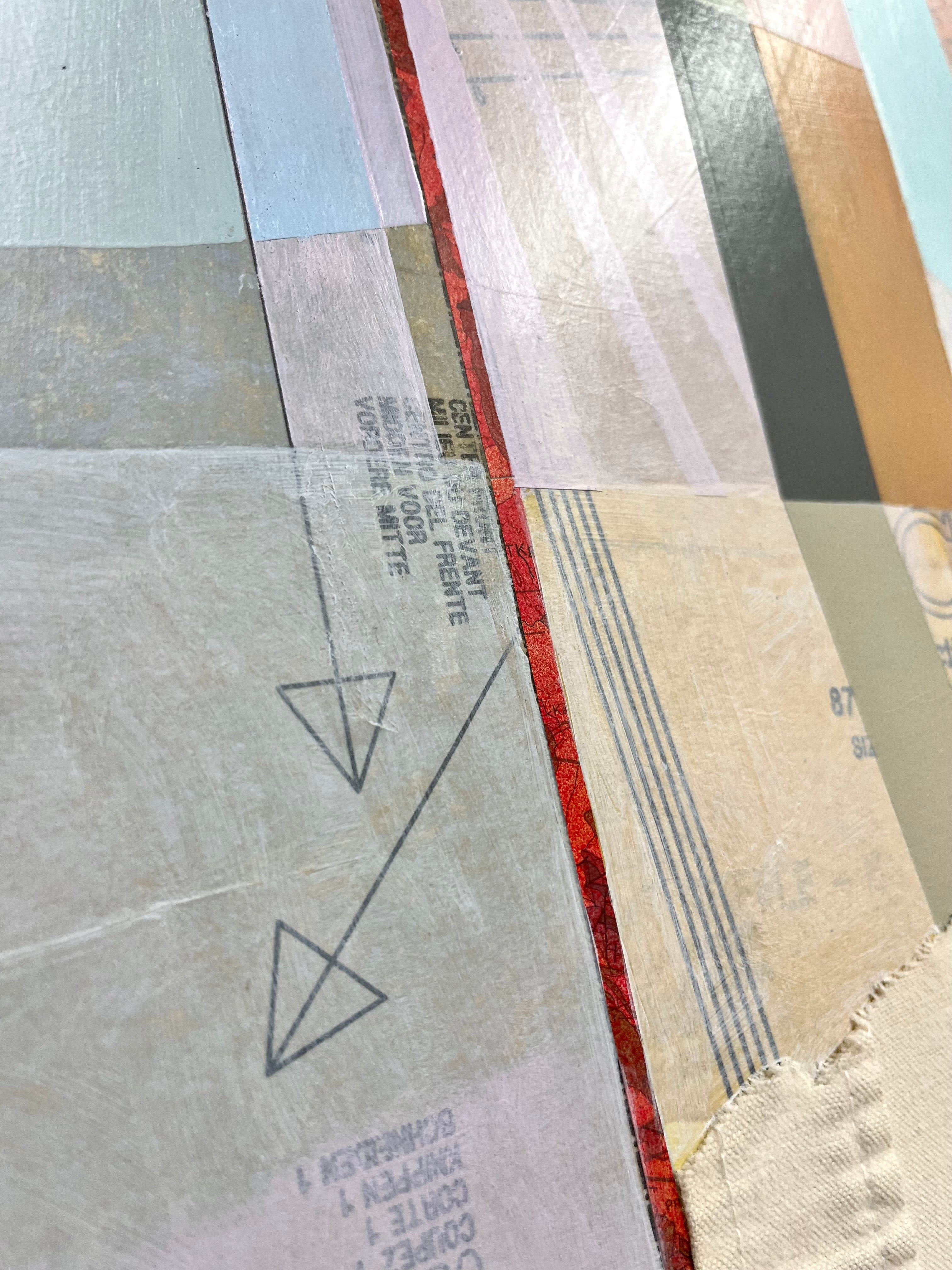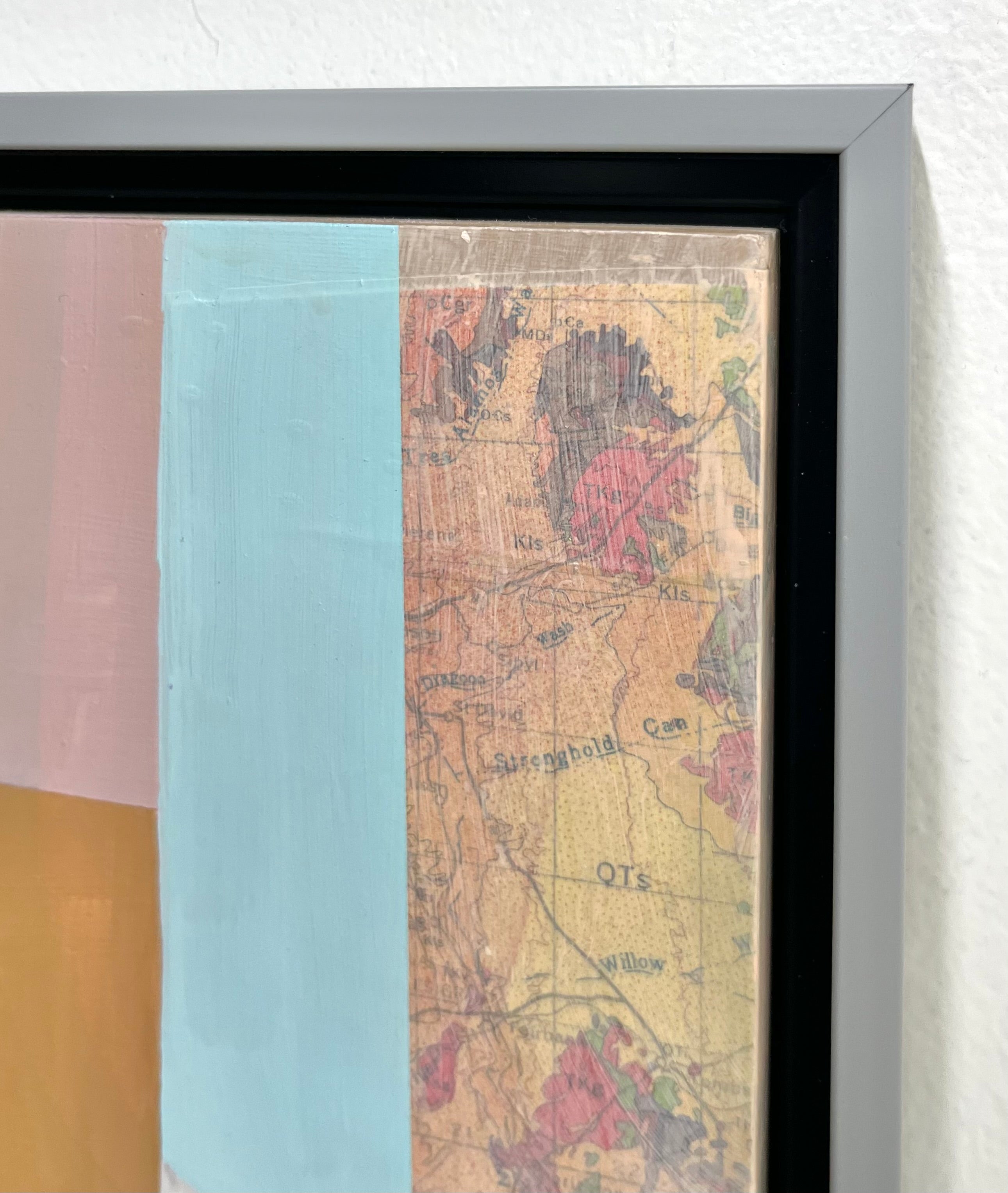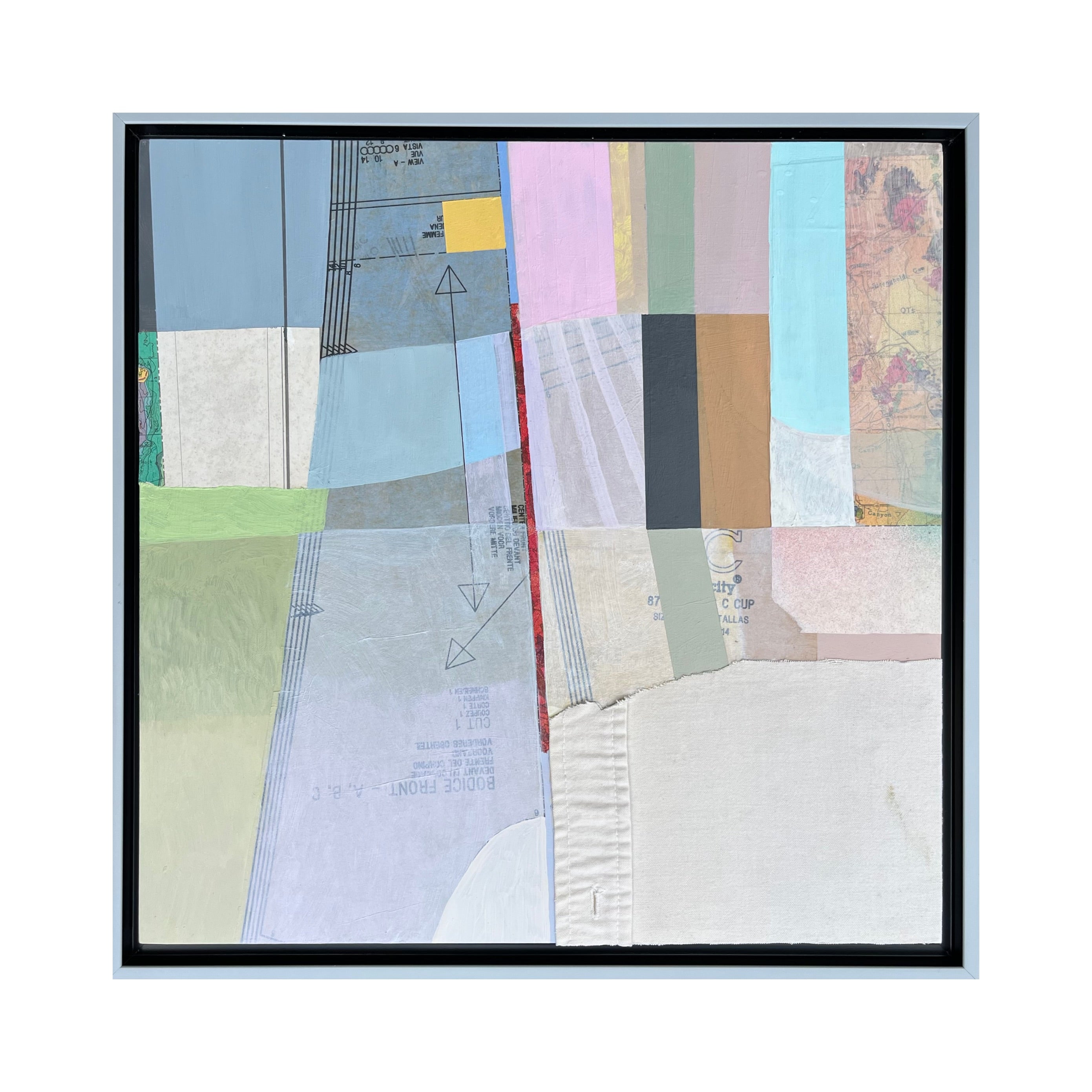 mixed media collage on panel, framed in silver floater frame
