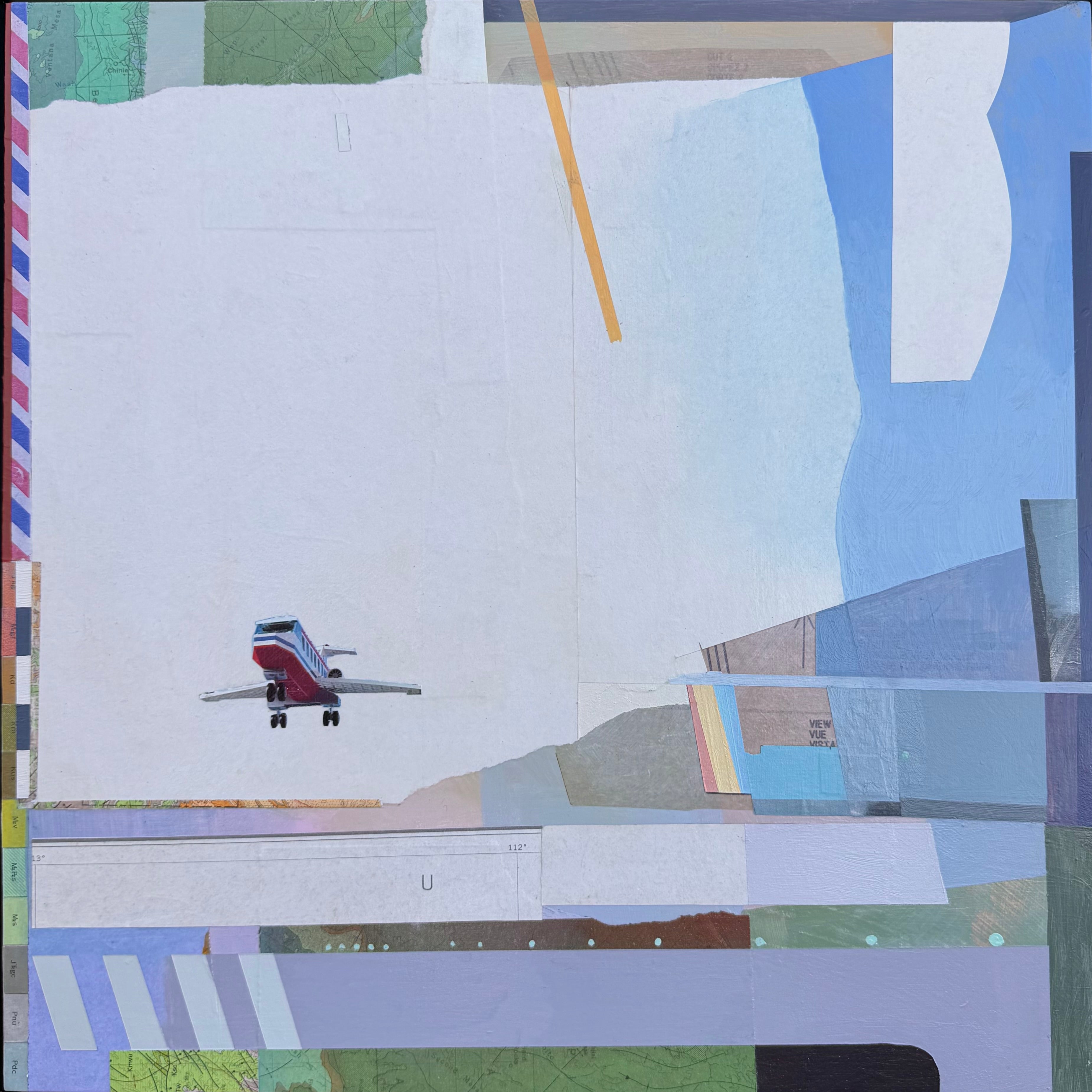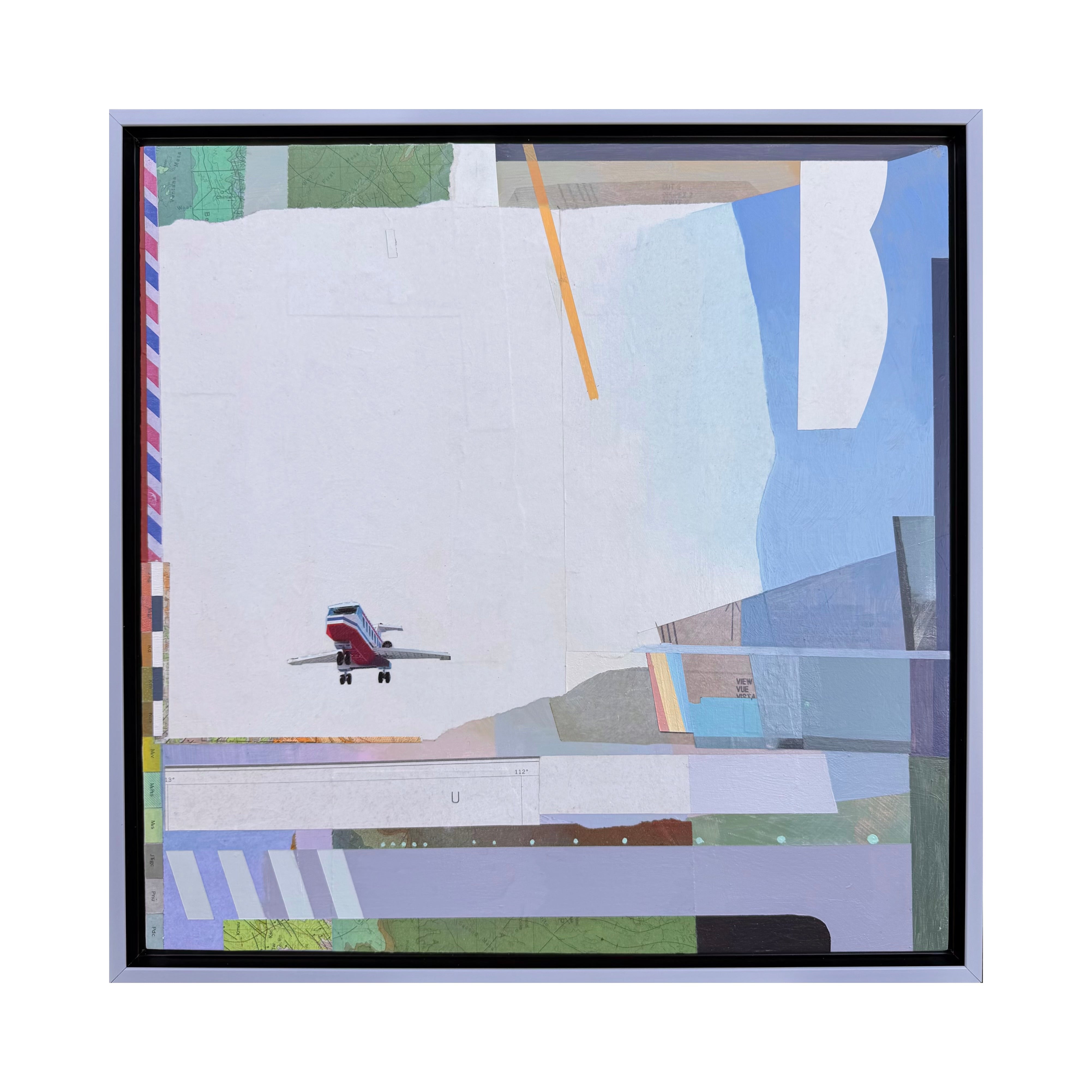 mixed media collage on panel, framed in silver floater frame